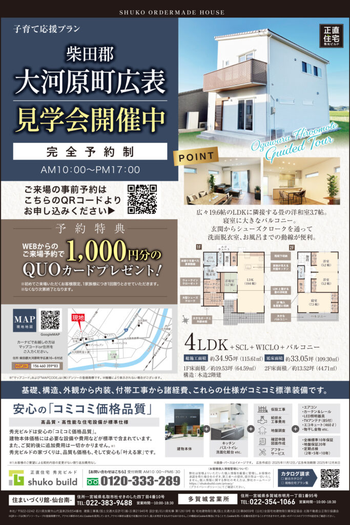 秀光ビルド仙台南店&多賀城営業所 柴田郡大河原町広表 見学会開催中!