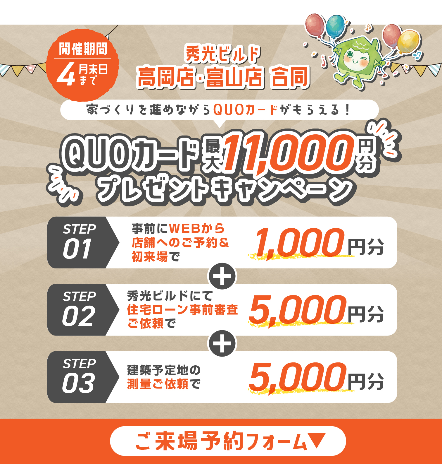 ※QUOカードは初回ご来場以降のご提案打ち合わせ時にお渡しいたします。
