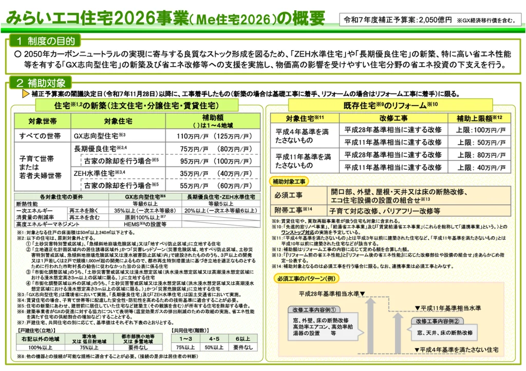 ※本掲載情報は、国土交通省が公表している「みらいエコ住宅2026事業」の概要に基づいて記載しています。