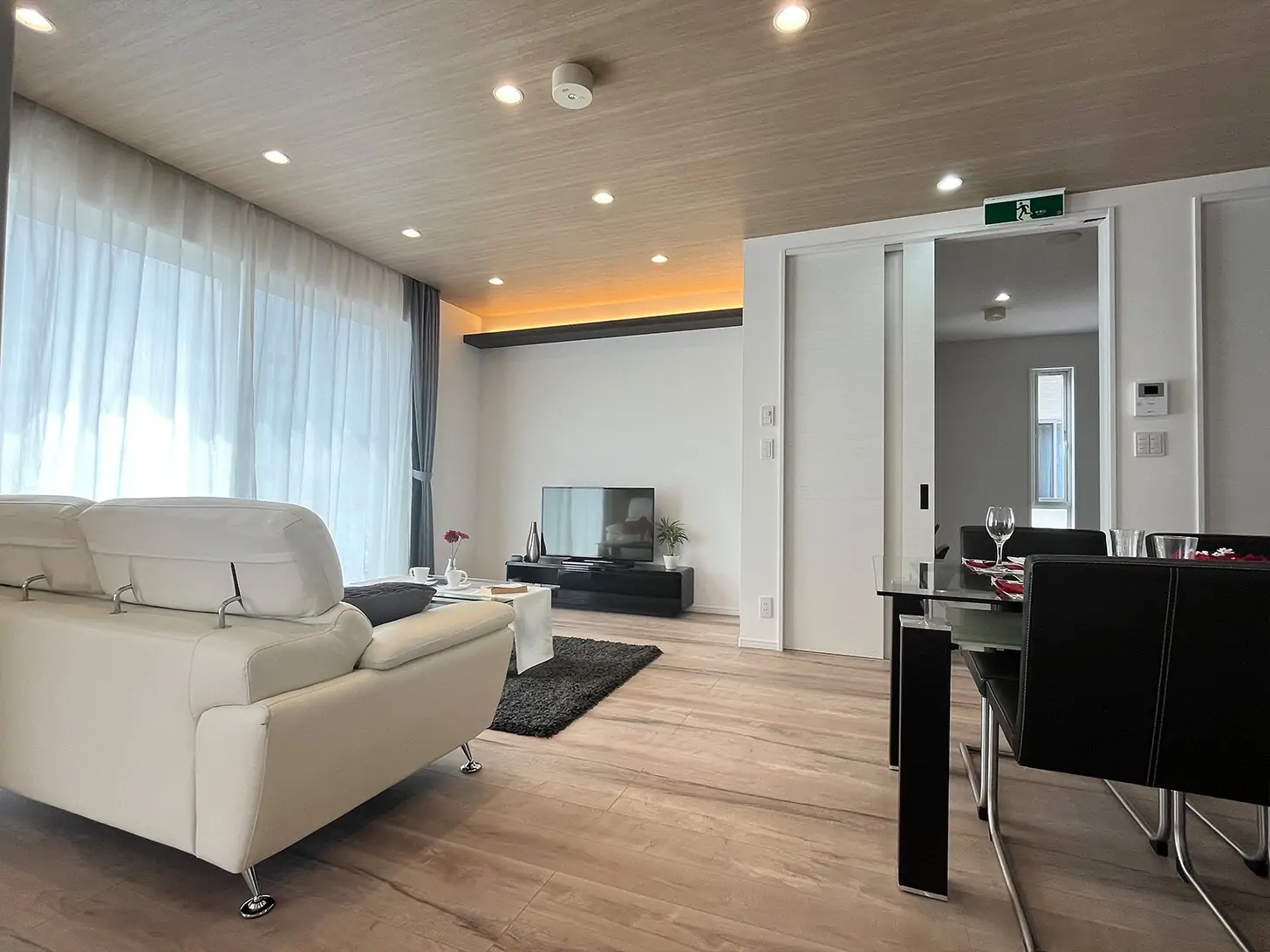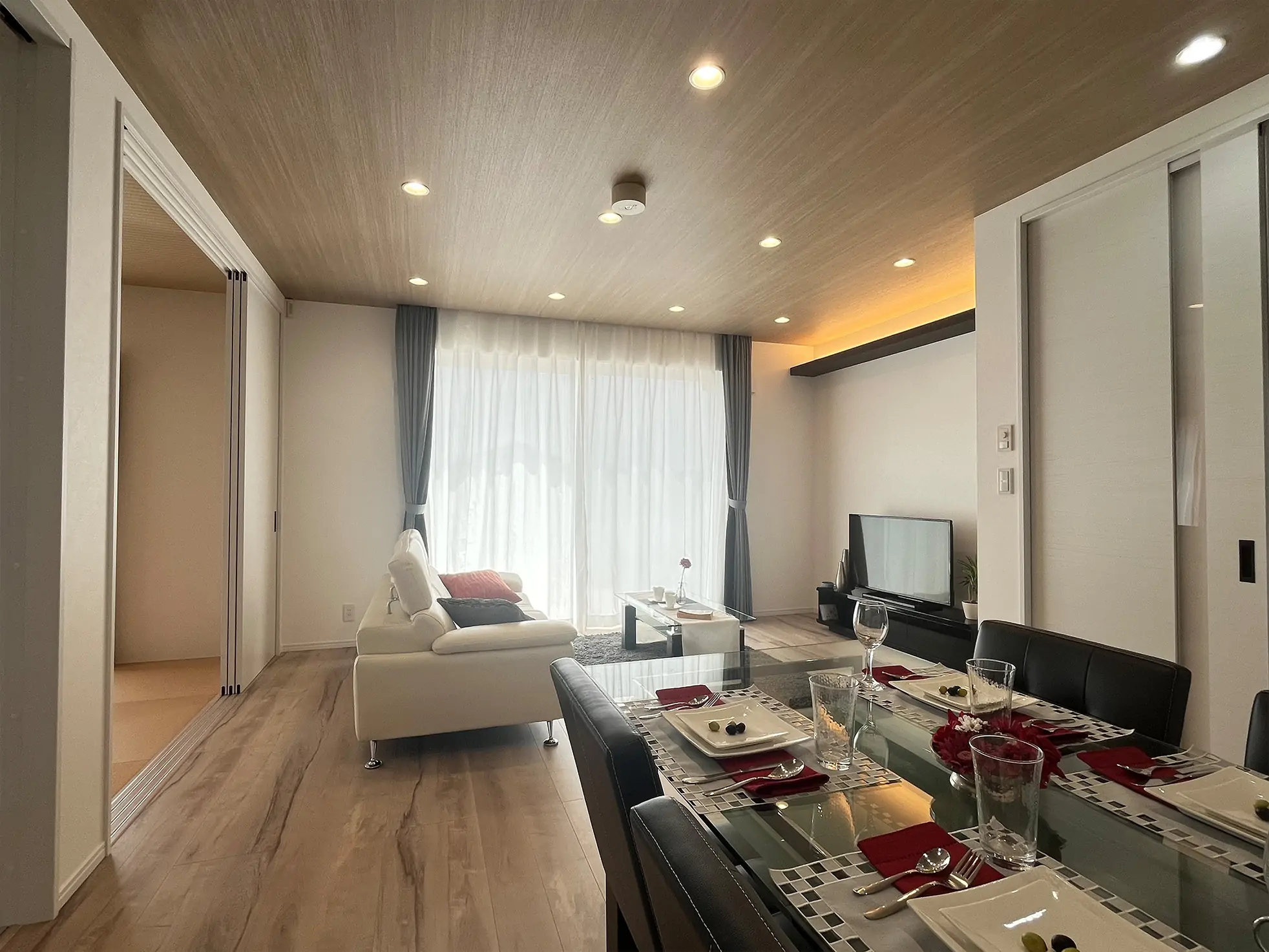 17.5帖のLDKと6帖の洋和室がつながった広い空間が見所となります。玄関からシューズクローク、パントリーとキッチンへの家事動線が使いやすいです。