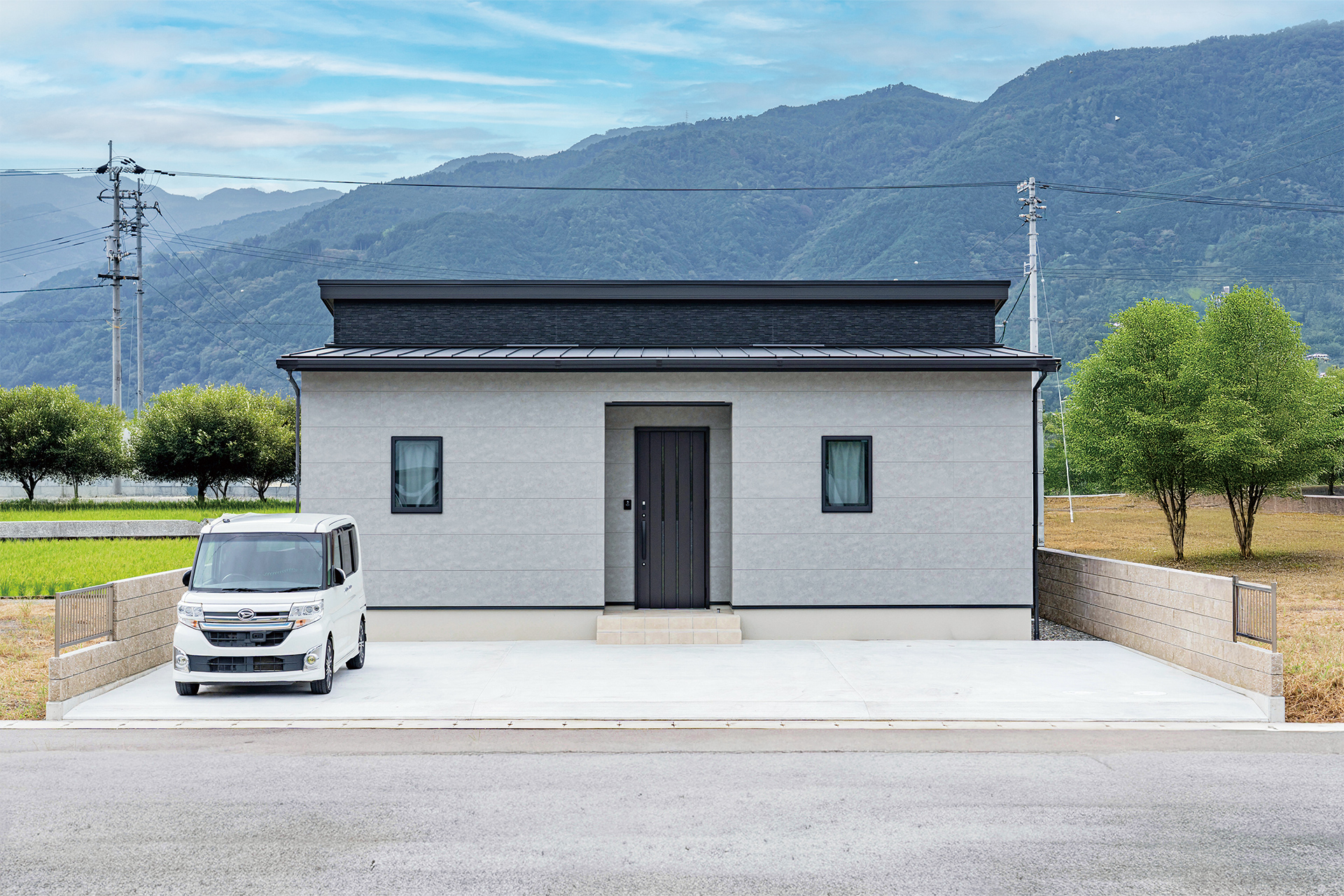 中央に玄関を設け、シンプルながらも可愛らしい印象を感じさせる、グレーベースの外観。