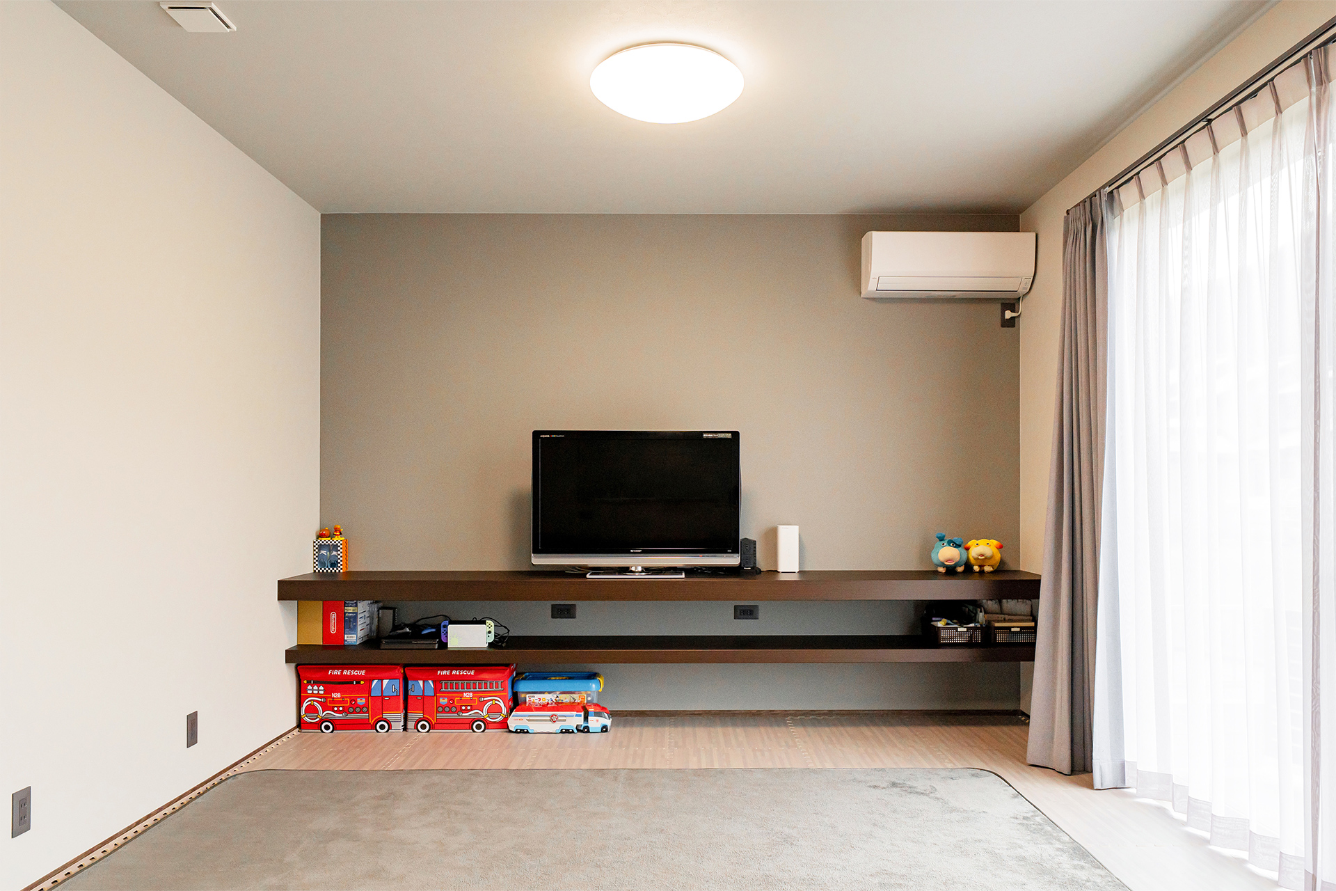 淡いグレーとホワイトのクロスで落ち着きのあるリビング。家族みんなでまったり過ごせます。