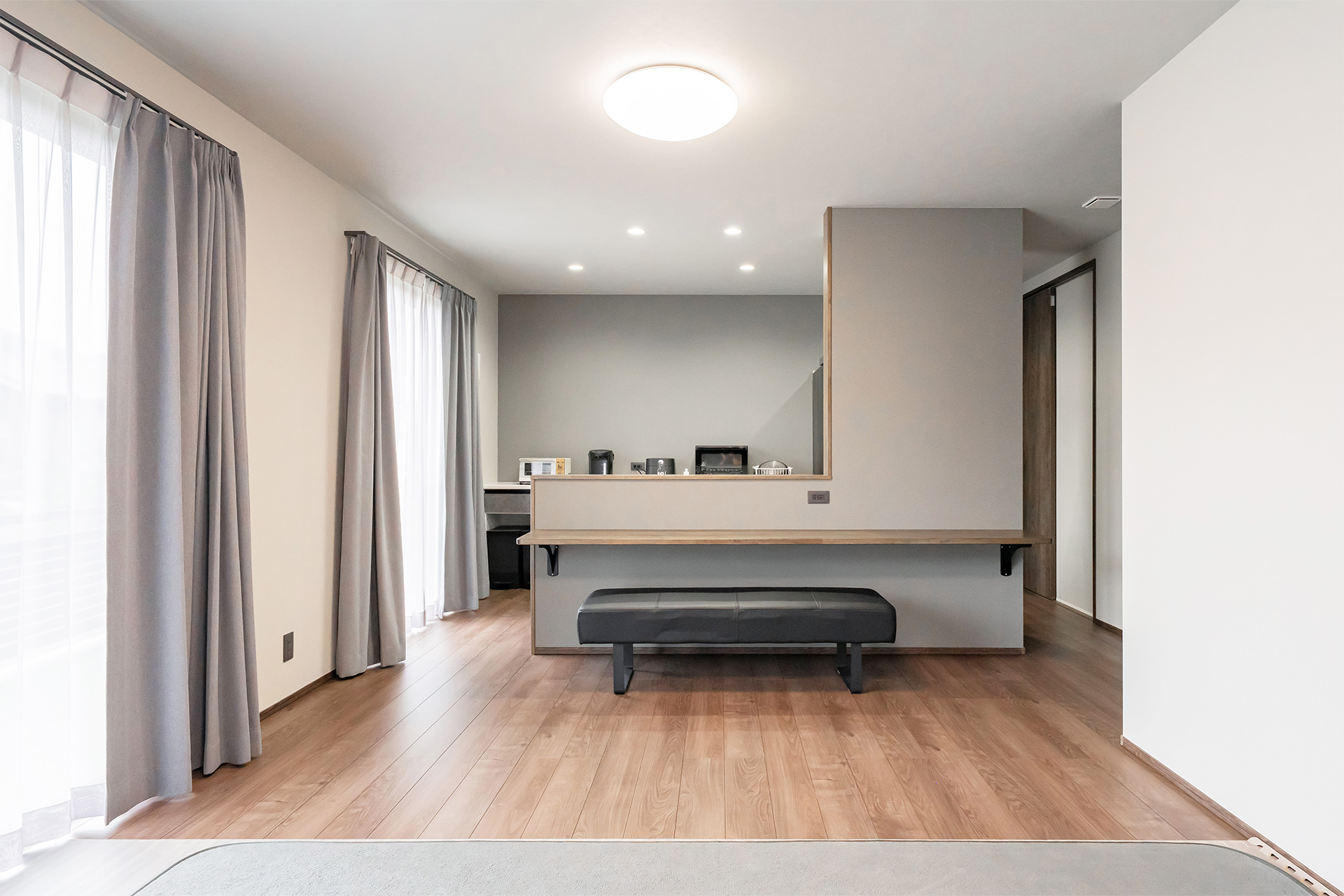 料理中の手元を隠せるキッチン。こちらもグレーで統一感を出しつつ、木目調で暖かい雰囲気を演出しています。