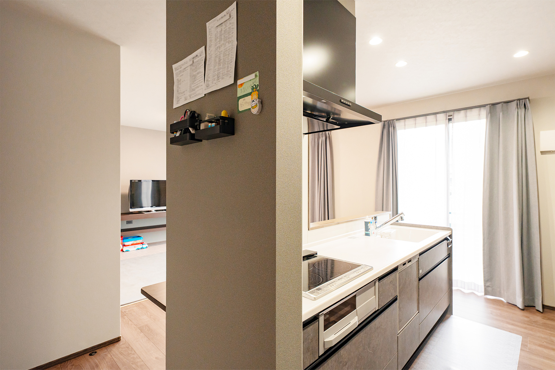キッチン裏の壁は磁石でくっつくようになっており、お子様の学校のお便りや小物入れなども自由に貼ることができます。