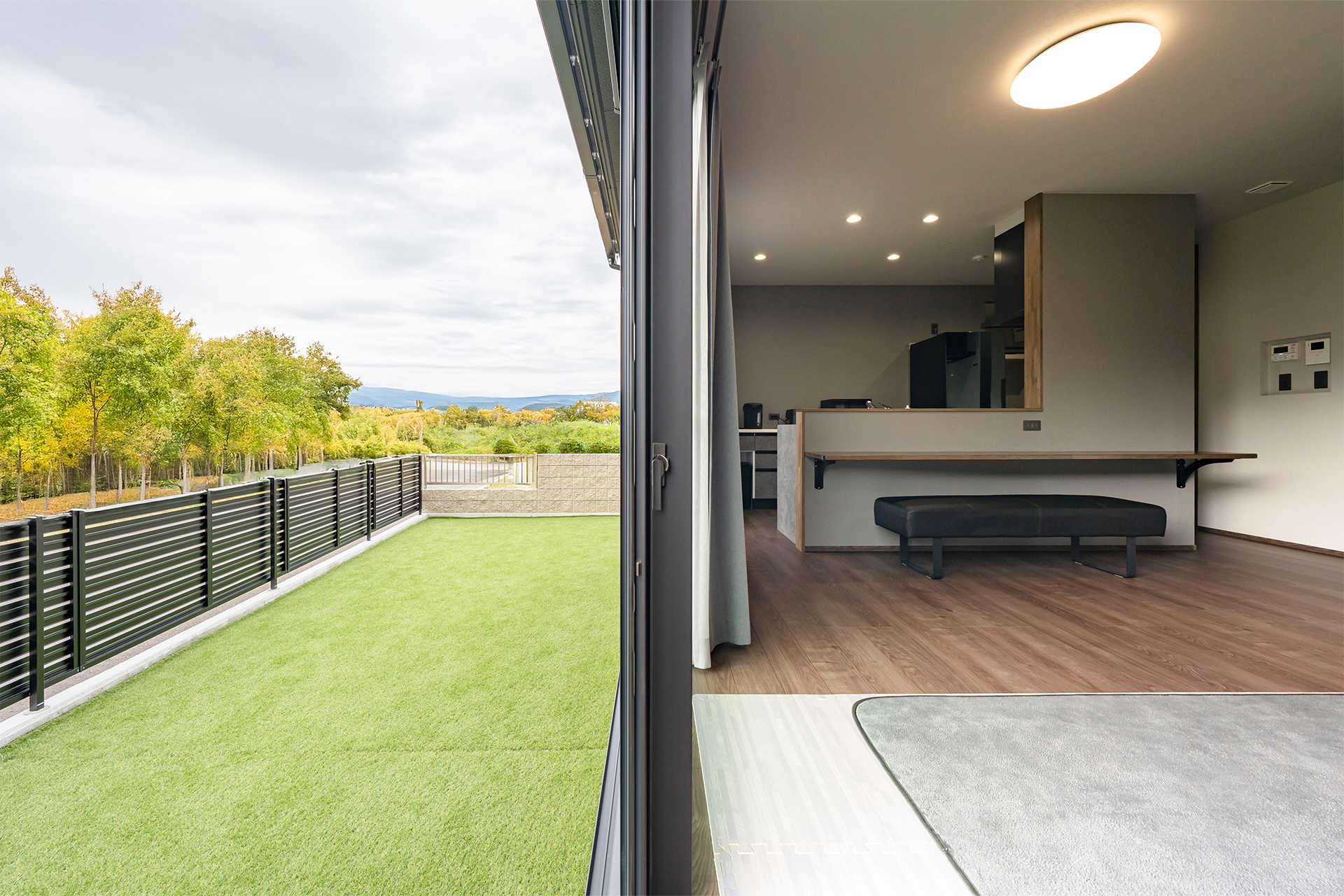 リビング横には広々とした中庭スペースあり。お子様ものびのび遊べる開放的なスペースです。