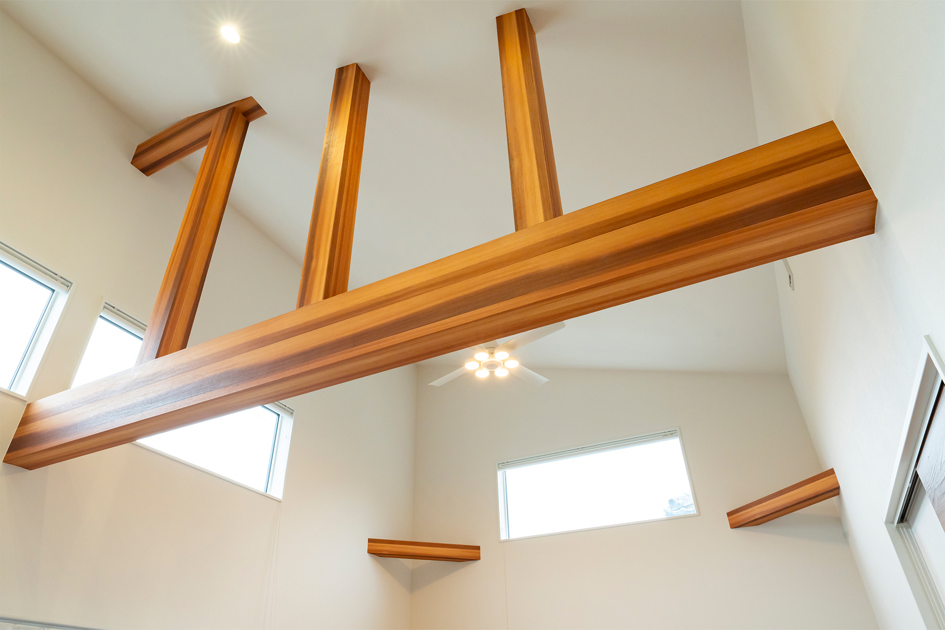 高い天井に存在感のある梁。シーリングファンで空気を循環し、効果的に省エネ。