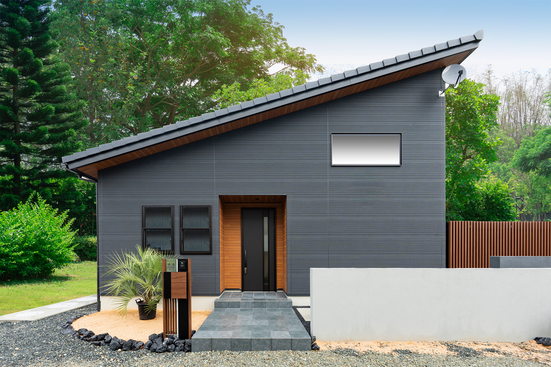 グレーとウッド調を組み合わせた外観。玄関まで繋がる特徴的な石のタイルを使った長いアプローチ。