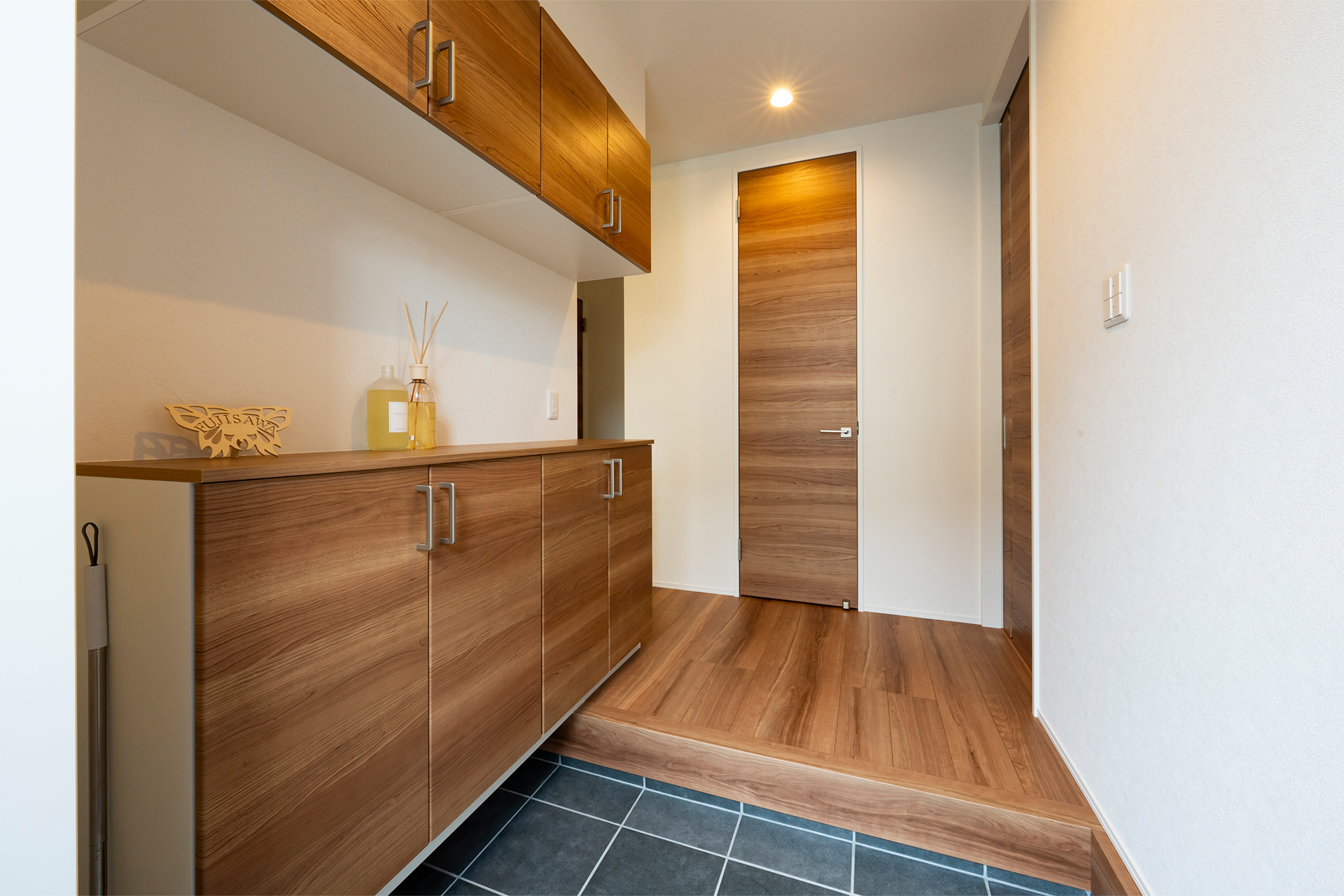 大型の玄関収納棚、ウッド調のあたたかな印象の玄関。