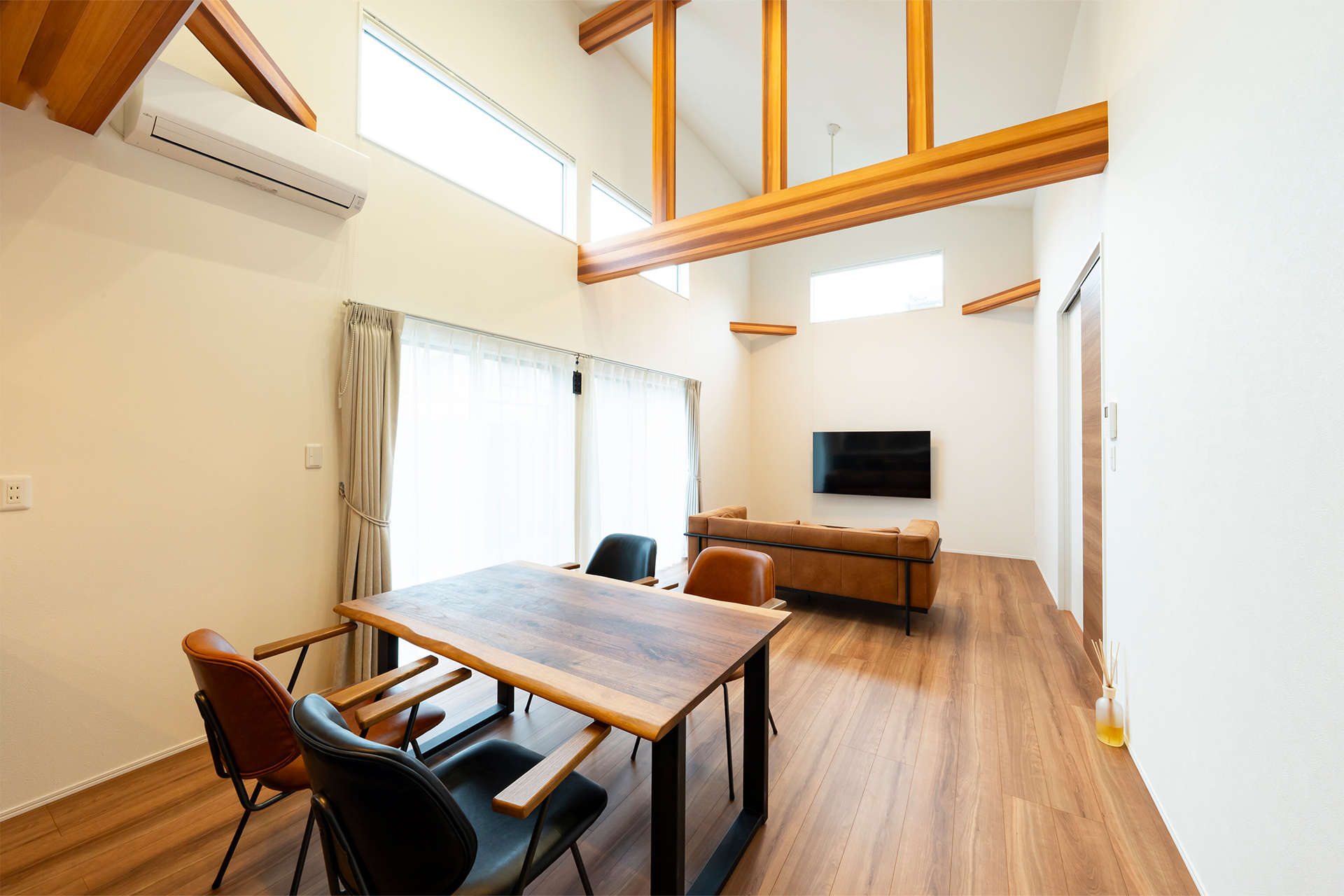 大きな梁と高い天井で開放感のある広々LDK。大きな窓で明るいリビング空間。