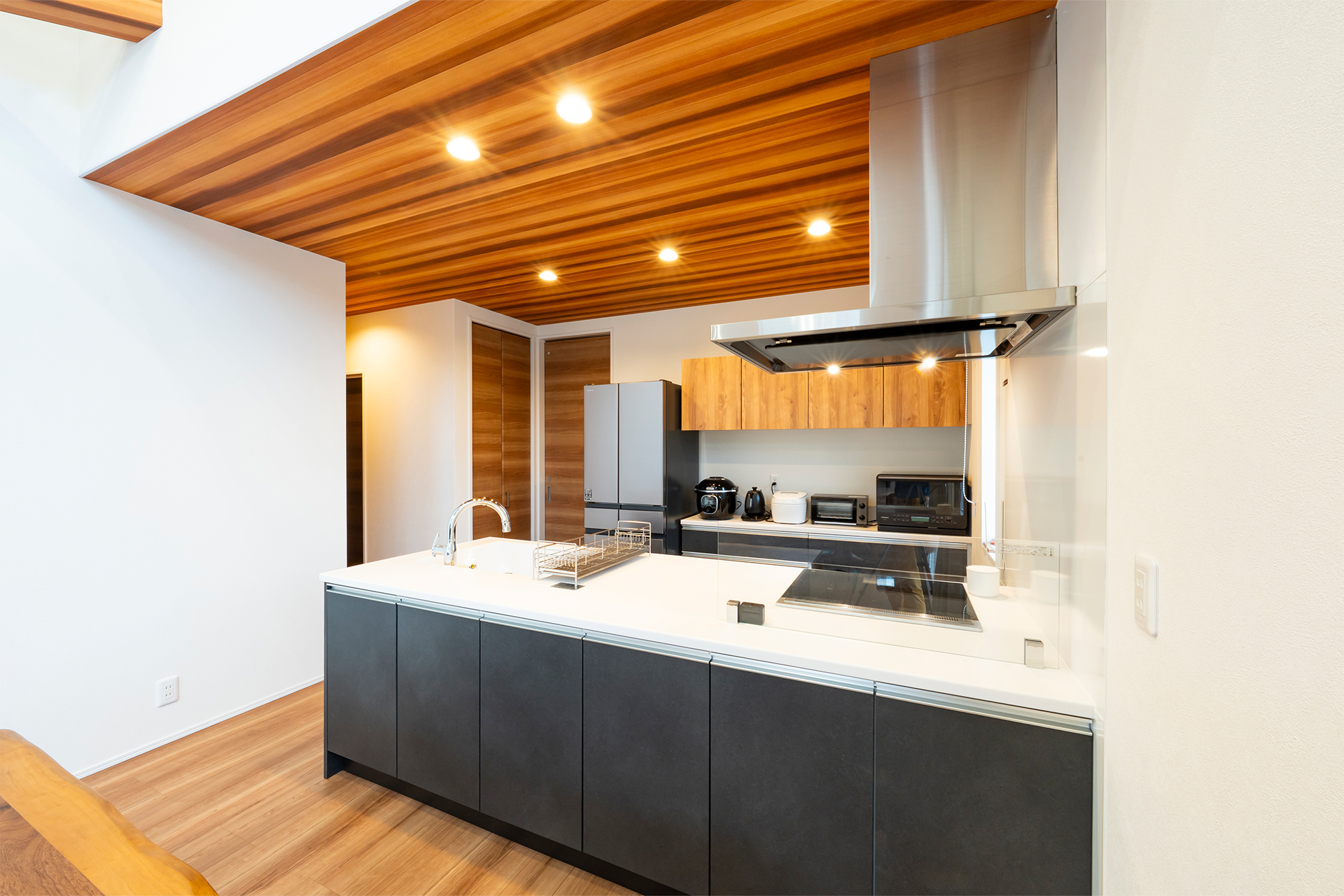 木目を効果的に配置したシンプルなキッチンは人気の対面キッチン。高級感のあるサイドマントルレンジフード採用。