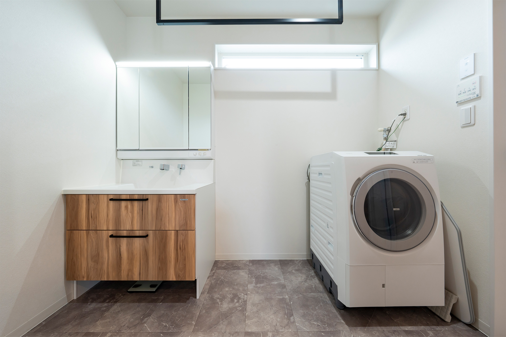 洗面脱衣室は、木目パネルの洗面台、洗濯に便利なホスクリーン、衛生的でおしゃれな床パネルを採用。