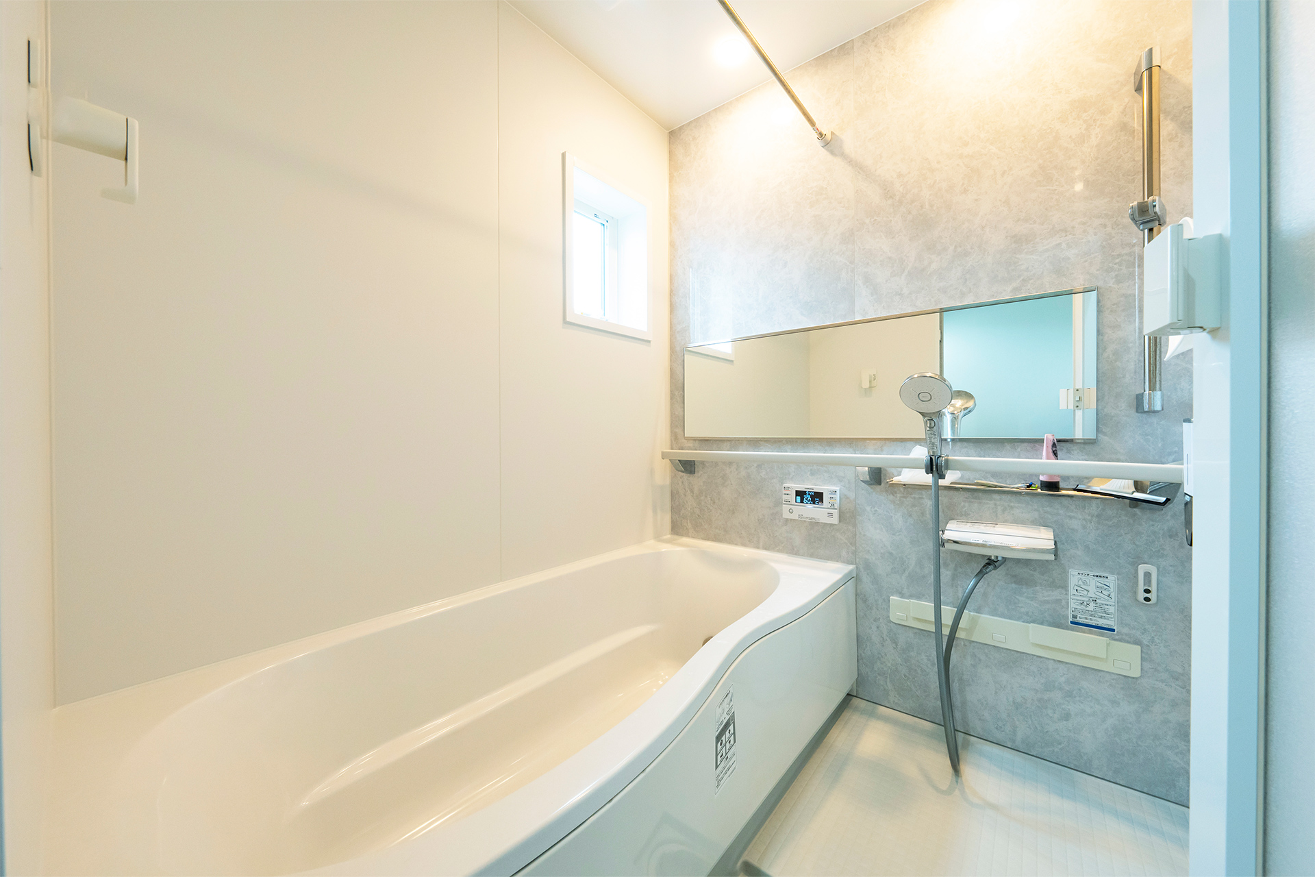 バスルームはグレーとホワイトの壁面の落ち着いた組み合わせ。