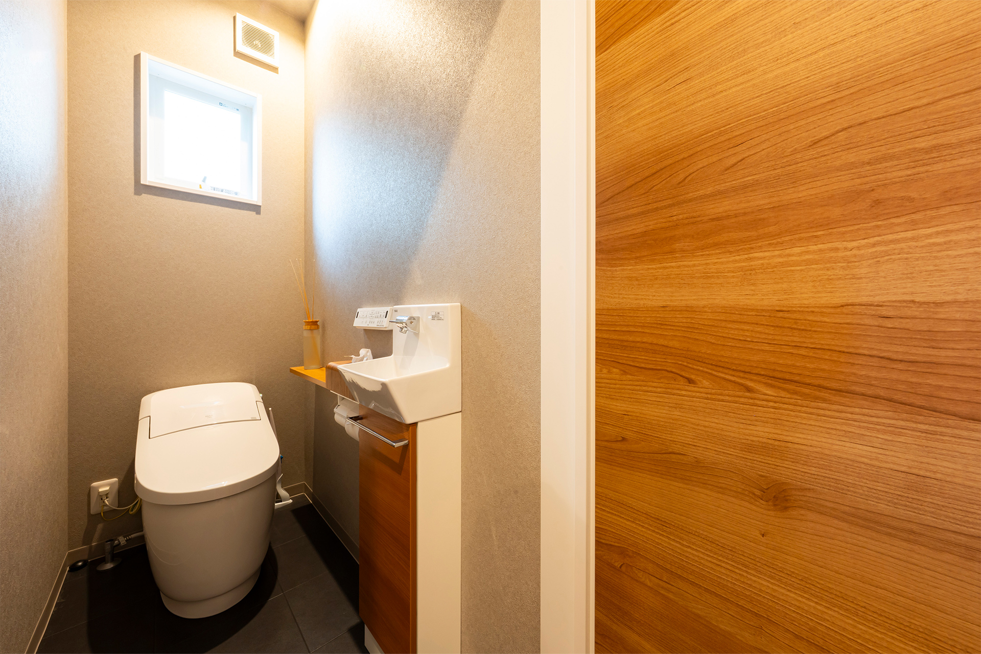 手洗器と収納棚を設置したトイレも木目調を生かしてナチュラルに。