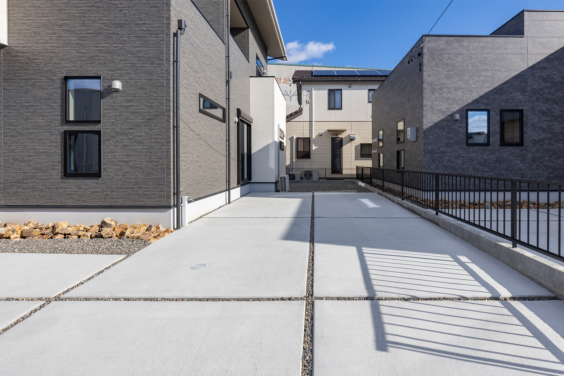 広い駐車スペースはスリット目地を入れたコンクリート仕上げ。