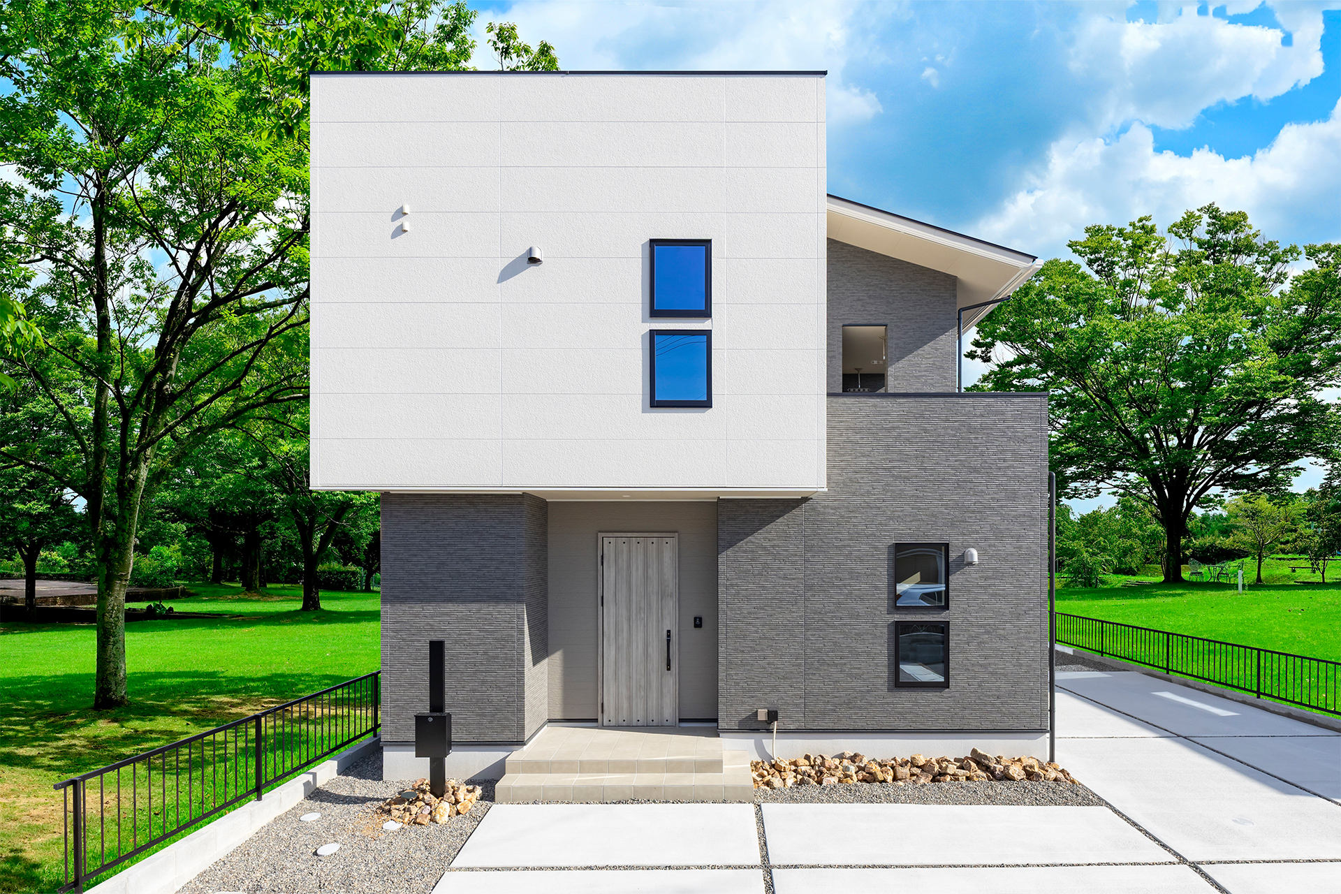 グレー&ホワイトの2トーンでモダンかつスタイリッシュな2階建。