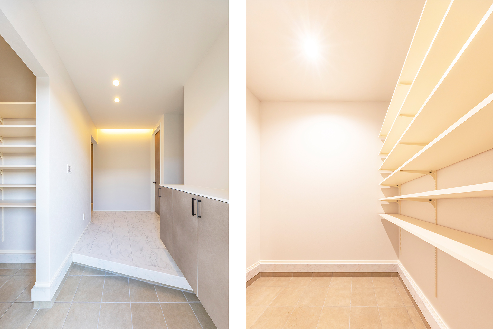 白で統一された玄関周りには玄関棚と大きなシューズインクロークを完備。