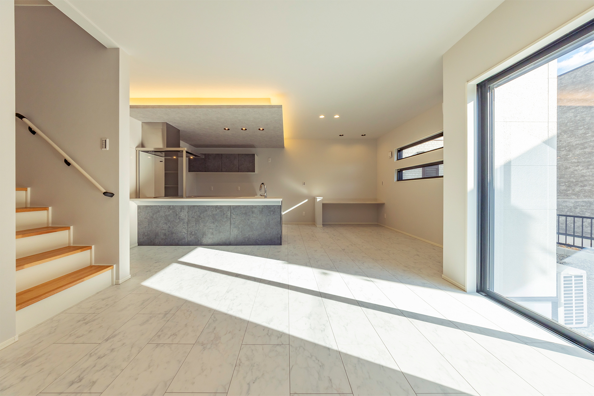 大きな窓とリビング階段で開放的な空間を演出したLDK。