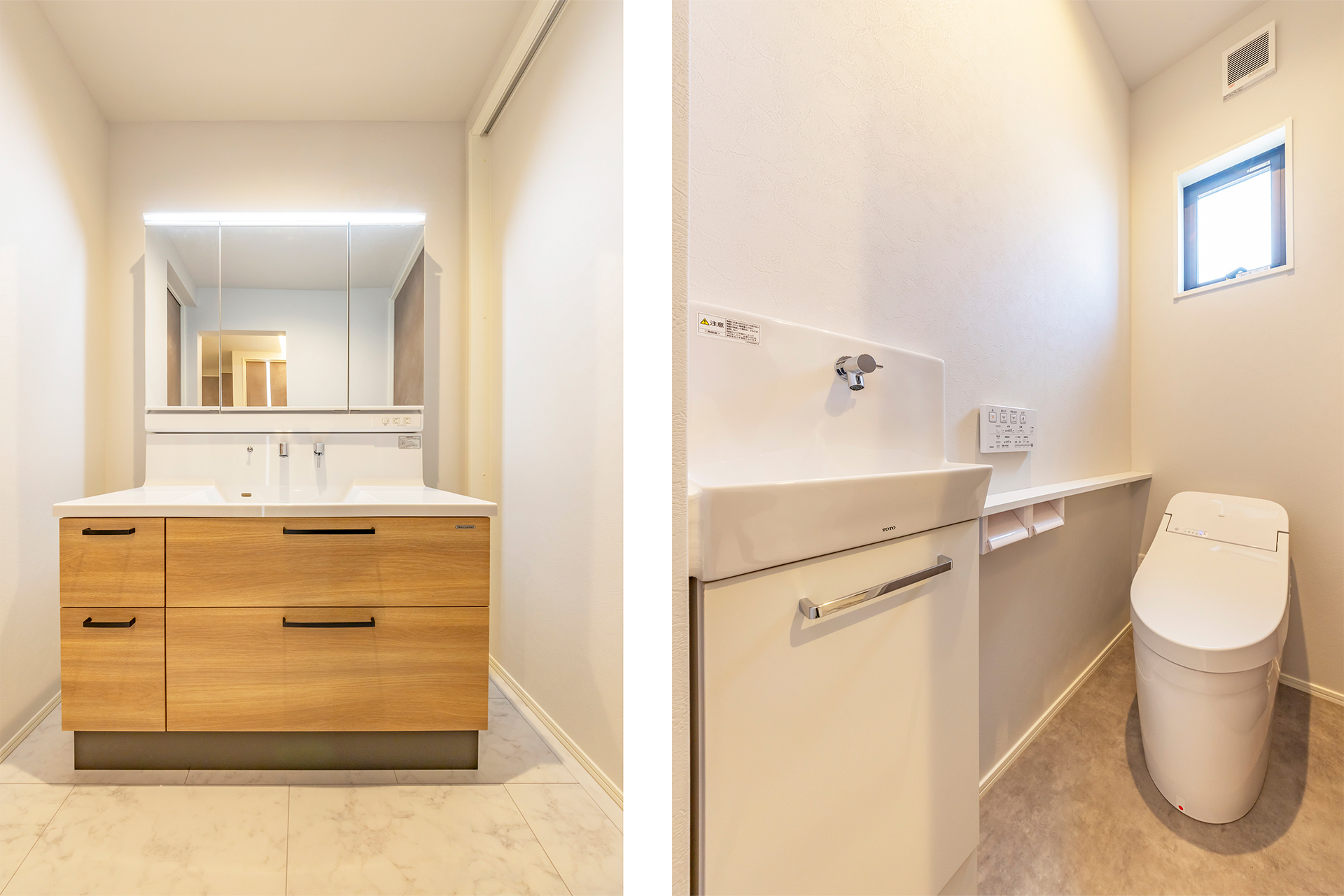 清潔感のあるウッドパネルの3面鏡洗面台と手洗いラック付きのトイレ、お手入れしやすいタイル柄の床。