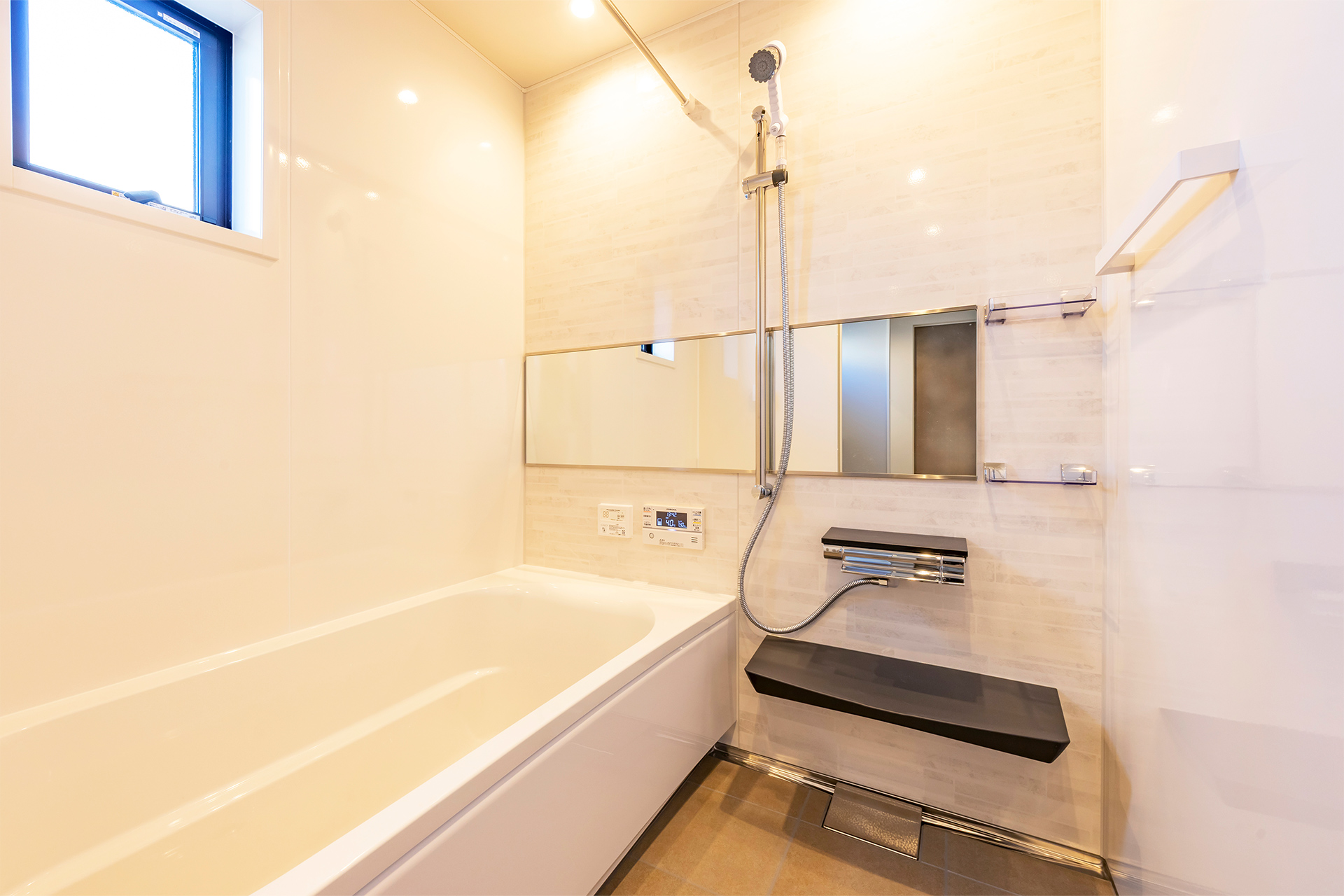 明かりの入る窓付き。白を基調とした大理石調の壁を採用した明るいバスルーム。