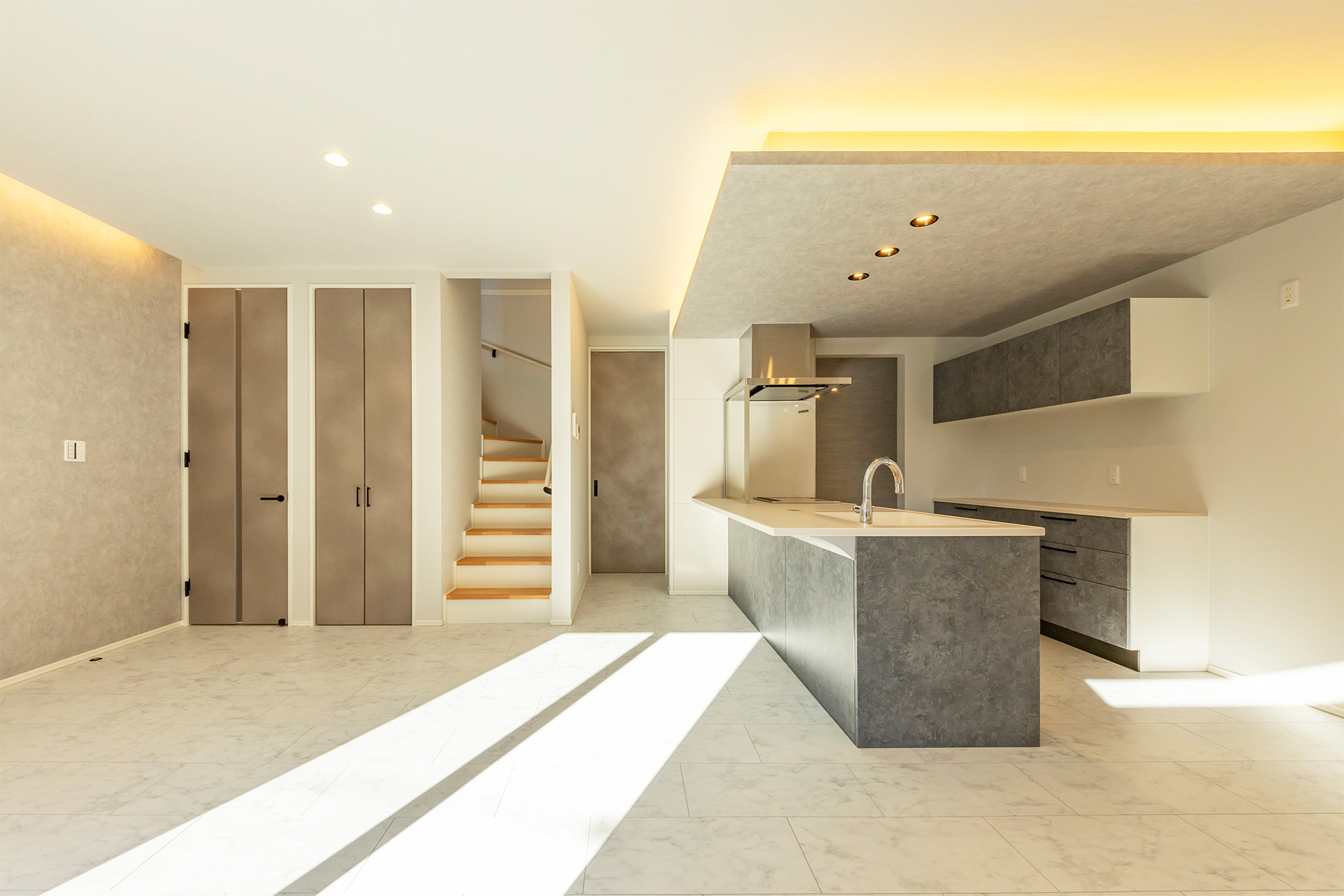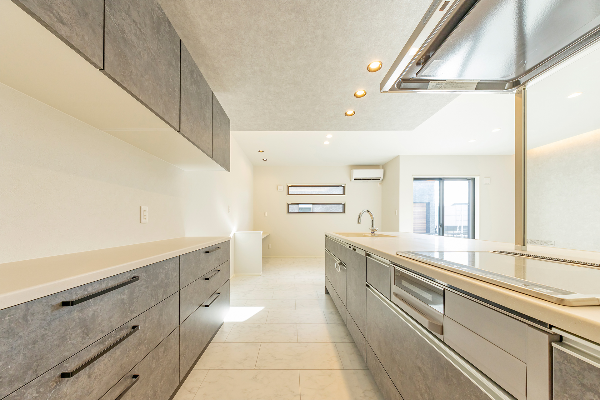 デザイン性の高い下がり天井のキッチンは、高級感のあるシックなグレーで統一。