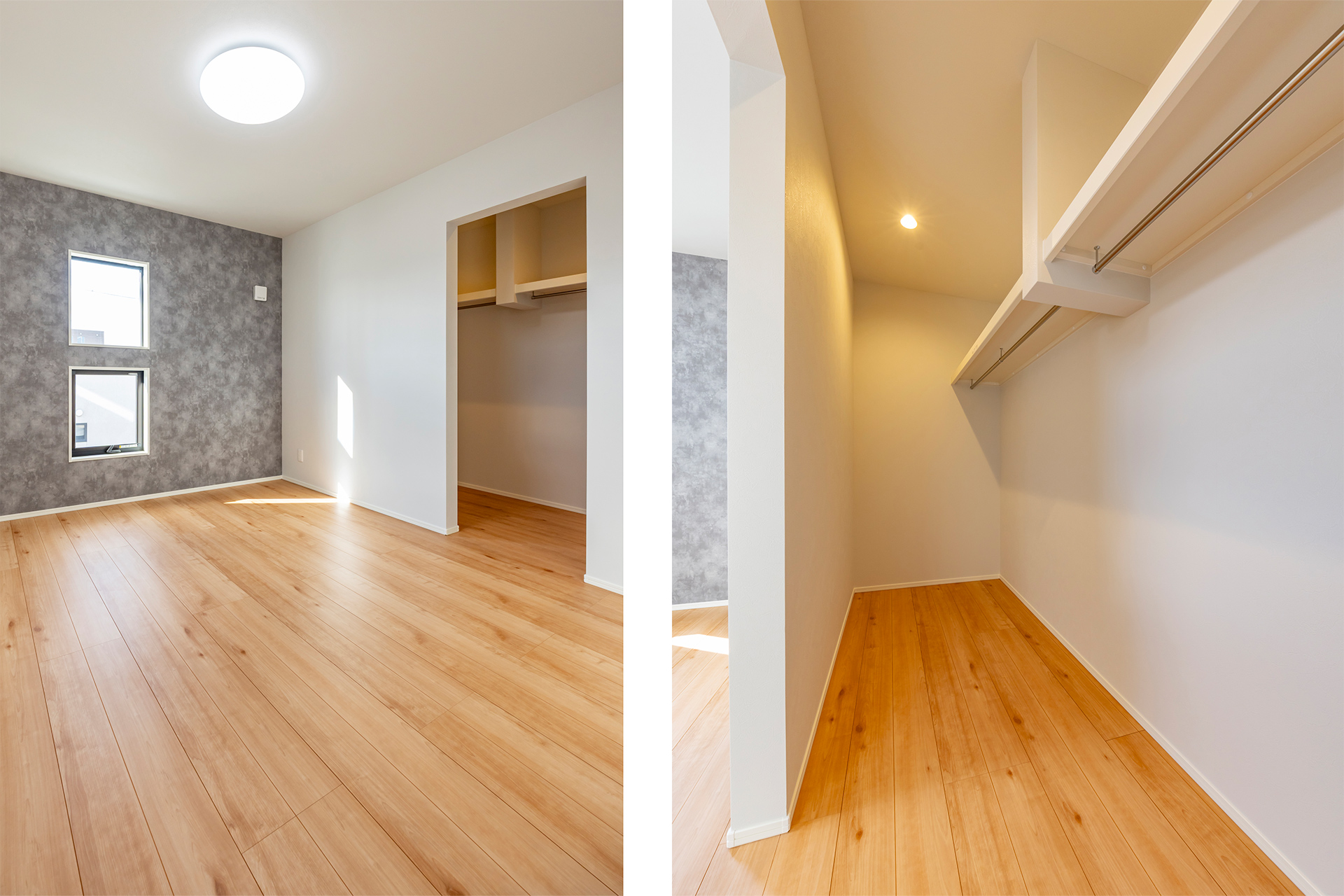 寝室に大きなウォークインクローゼットでたっぷり収納。