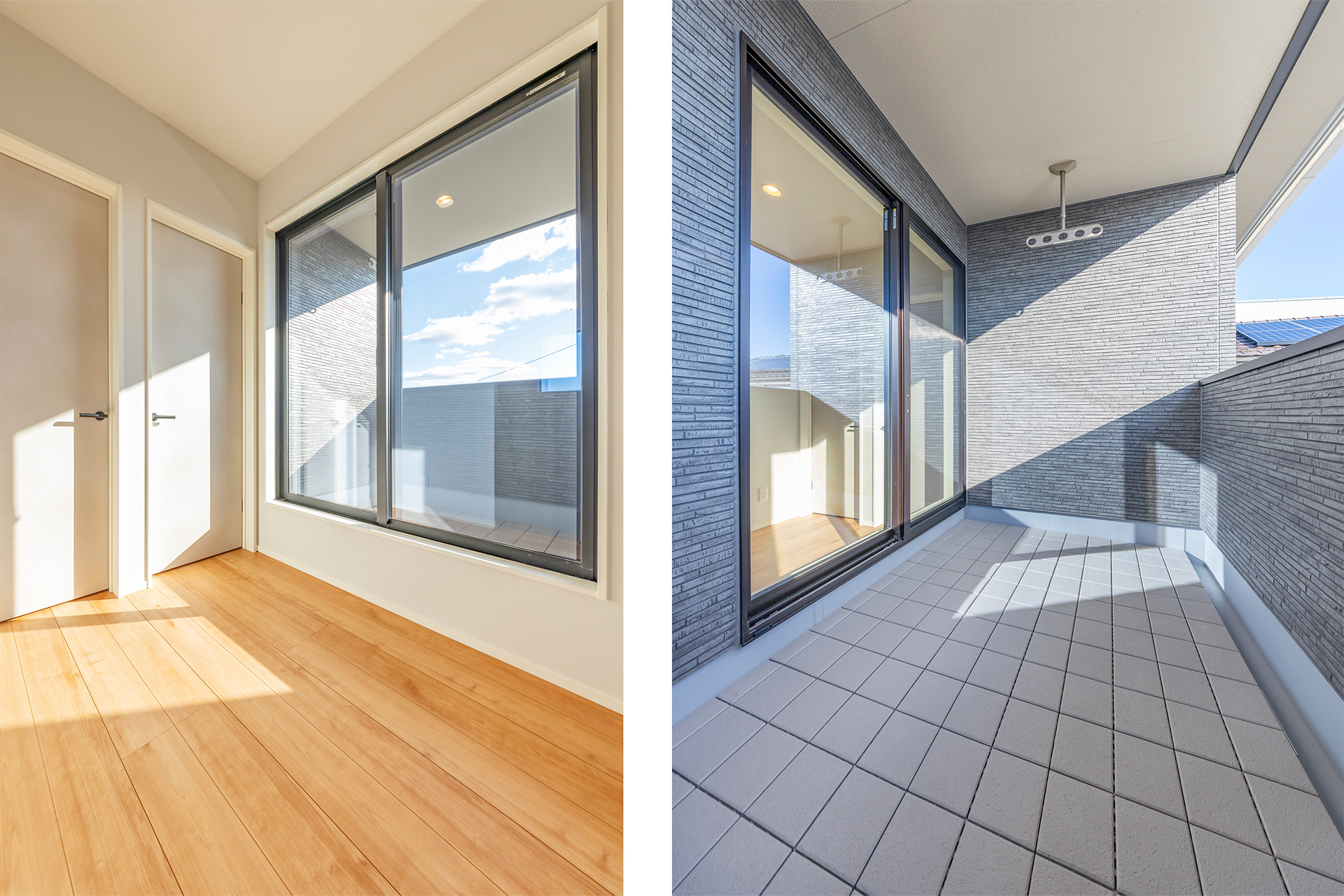 大きな窓で明るい部屋と繋がる大きなベランダはいろいろ使えそうな魅力のスペース。