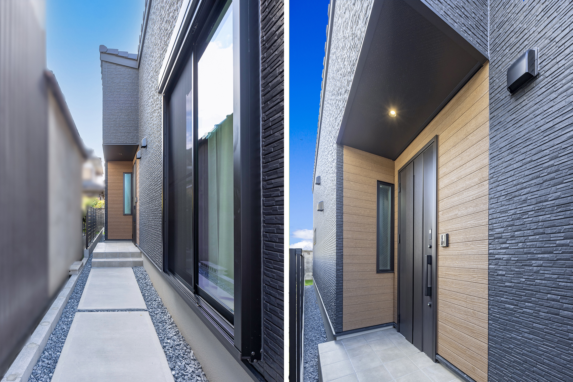アプローチから続く玄関ポーチには、外壁の一部に温かみのある木目調のアクセントを採用しています。