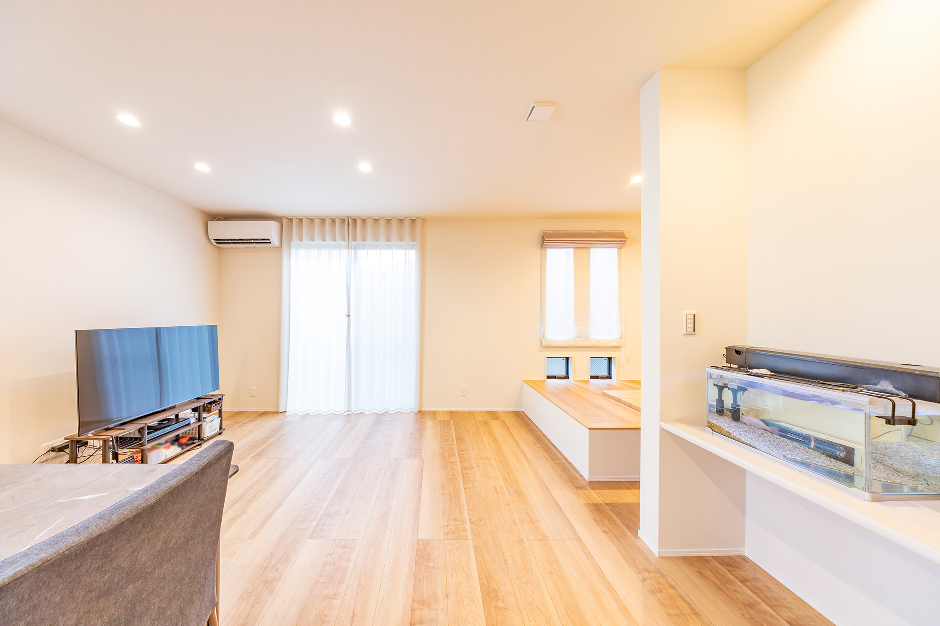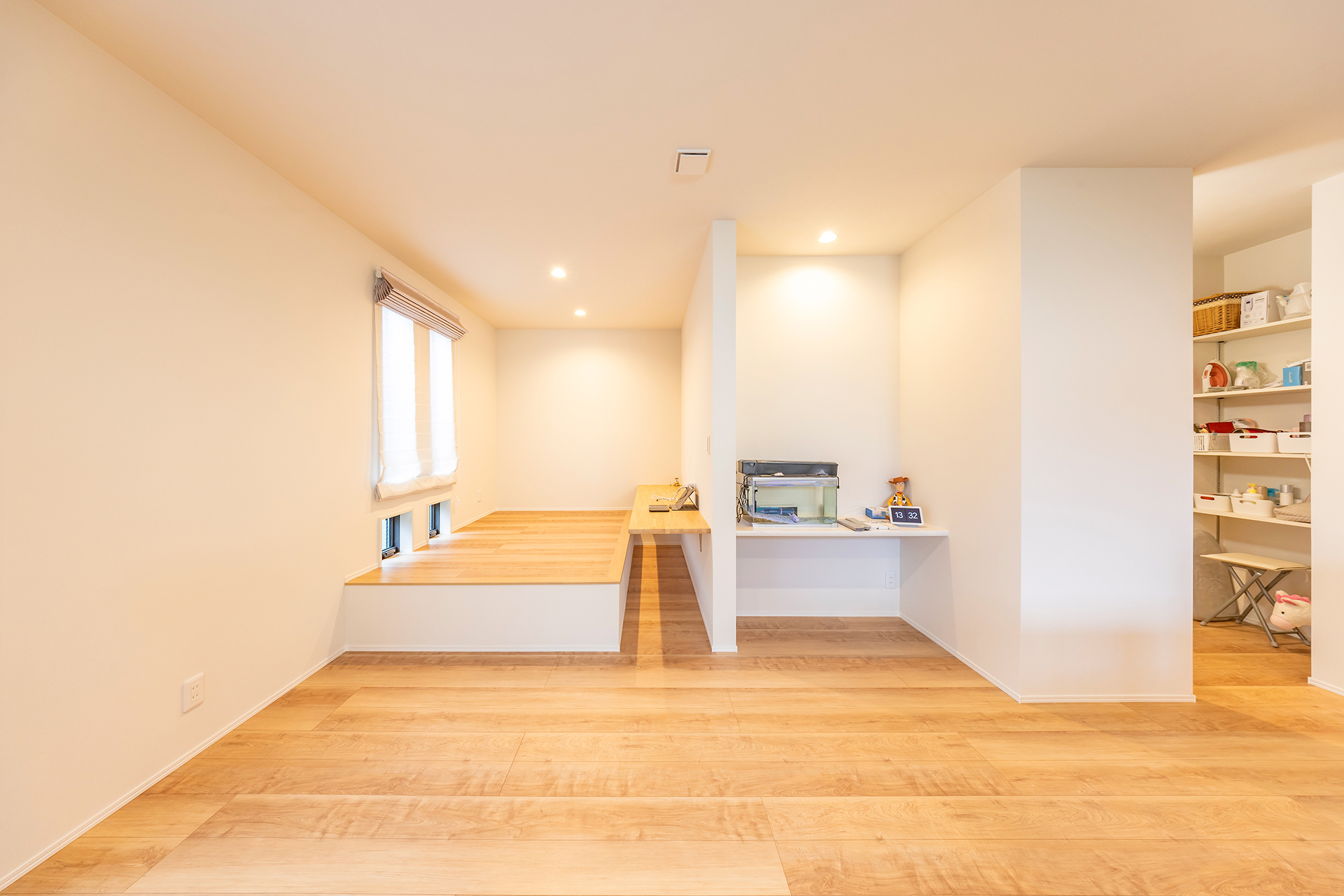 リビングの一角に設けられた小上がりスペースは、お子さまの勉強場所として、テレワーク時のワークスペースとして多目的に大活躍。
