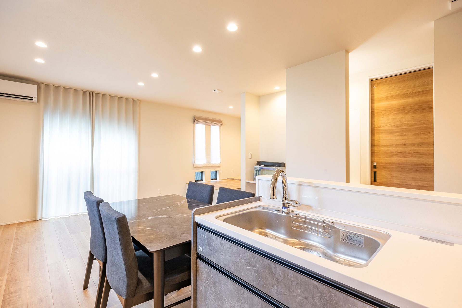 キッチンからは、ダイニングでくつろぐ家族や、奥のリビングでテレビを見るお子さまの様子まで視線が届きます。