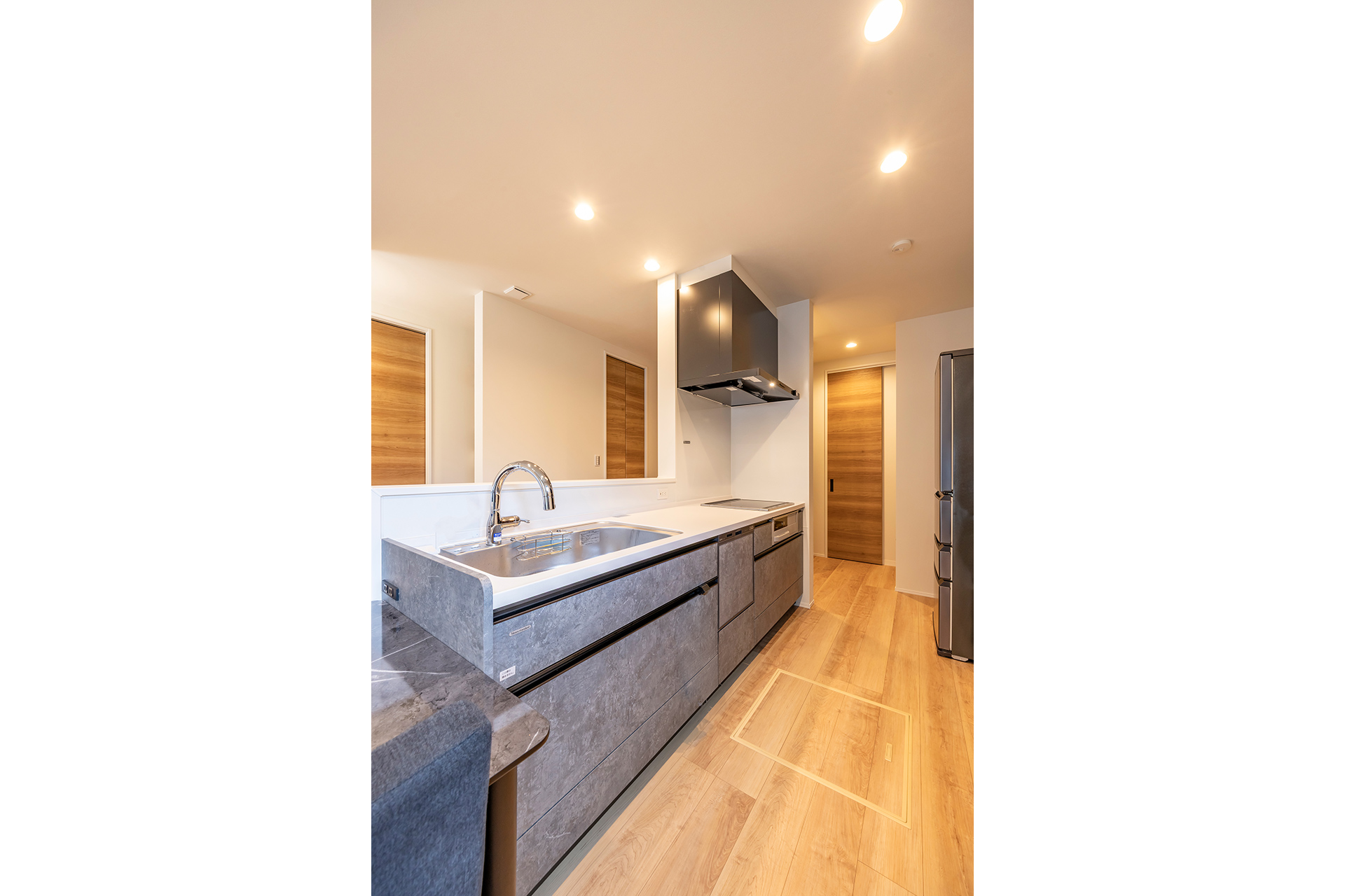 シックなグレーでまとめられた、洗練された対面キッチン。