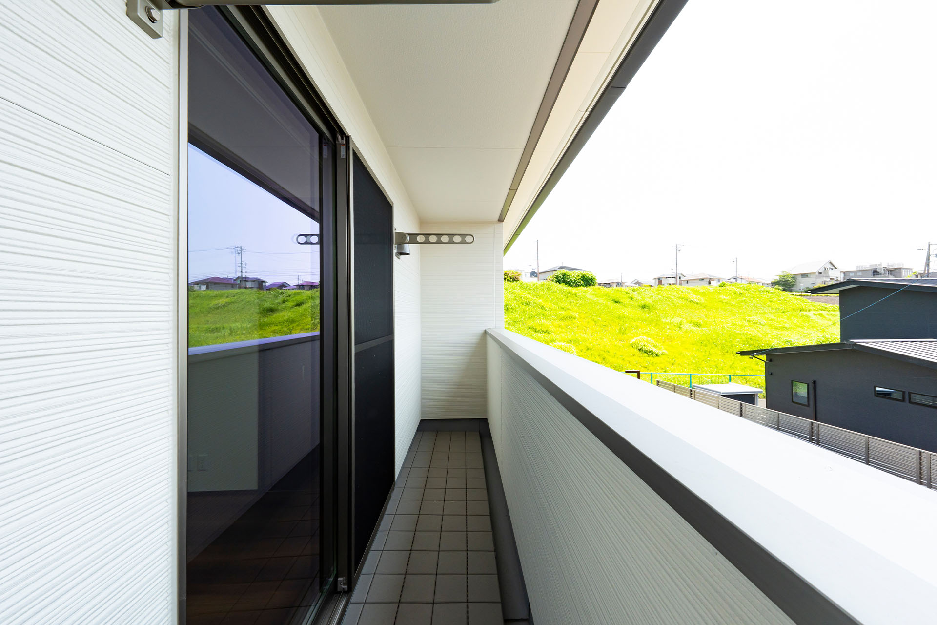 2階世帯には大きな布団も干せる横長のベランダがあります。屋根があるので急な雨でも洗濯物が濡れず安心。