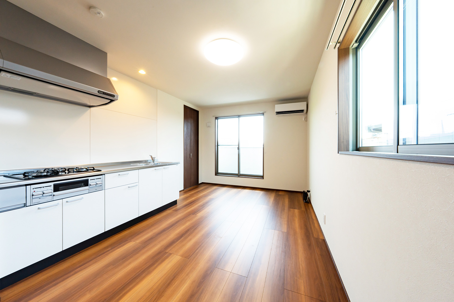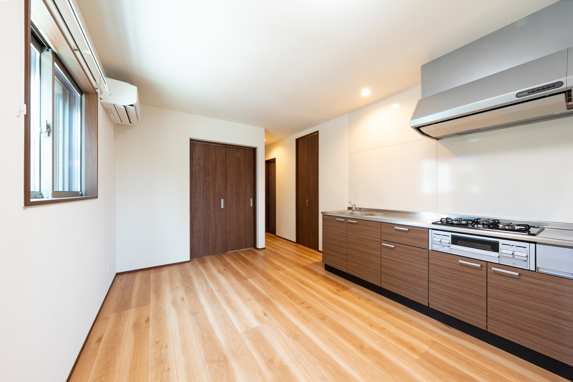 ダイニングのフローリングは1階世帯とは違いダークな木目調でシックなデザイン。ホワイトカラーのキッチンで、圧迫感なく明るい印象に。