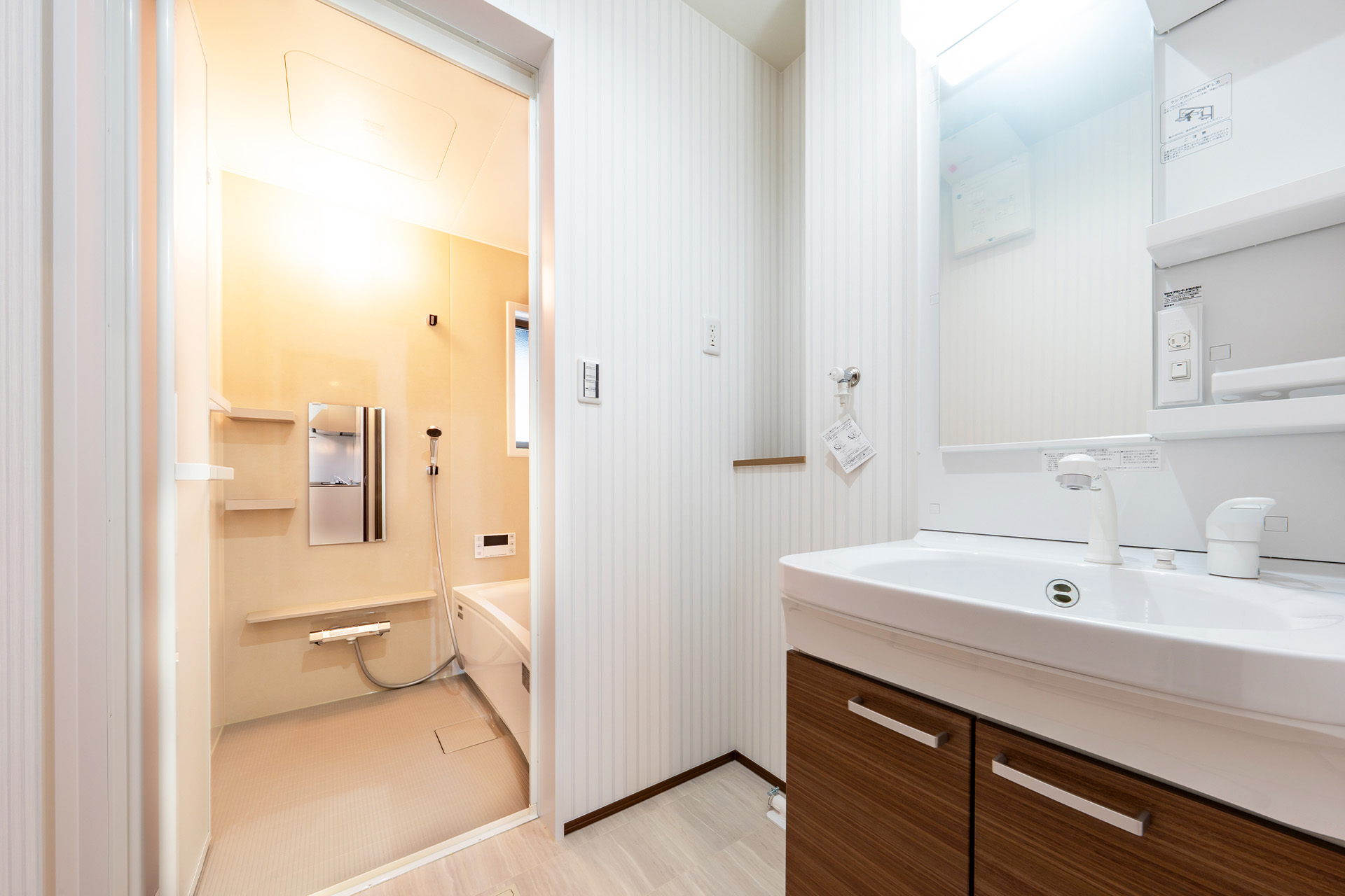 清潔感ある洗面脱衣室・バスルーム。ストライプの壁紙が可愛らしい印象です。