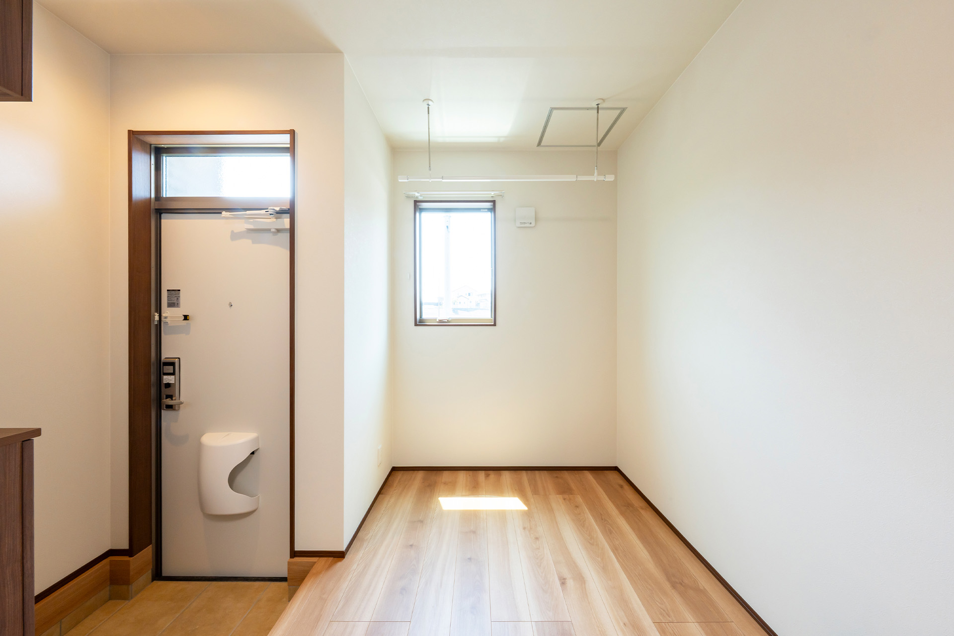 玄関横には南向きで日当たりの良い物干しスペースあり。便利なホスクリーン付きで、取り外しも可能。換気もしやすい明るい窓で、部屋干しもラクラク!