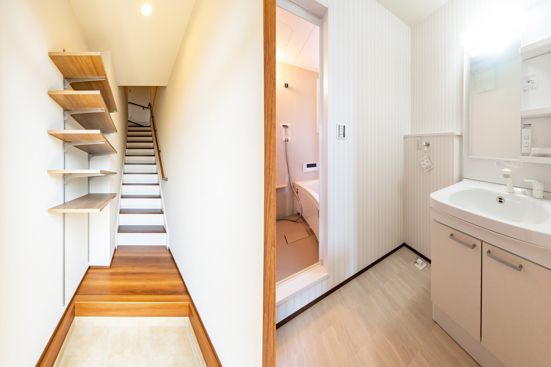 続いて、別世帯の間取りをご紹介します。2階に繋がる玄関階段を登った奥には洗面脱衣室を配置。こちらもストライプの壁紙が可愛らしいデザインです。