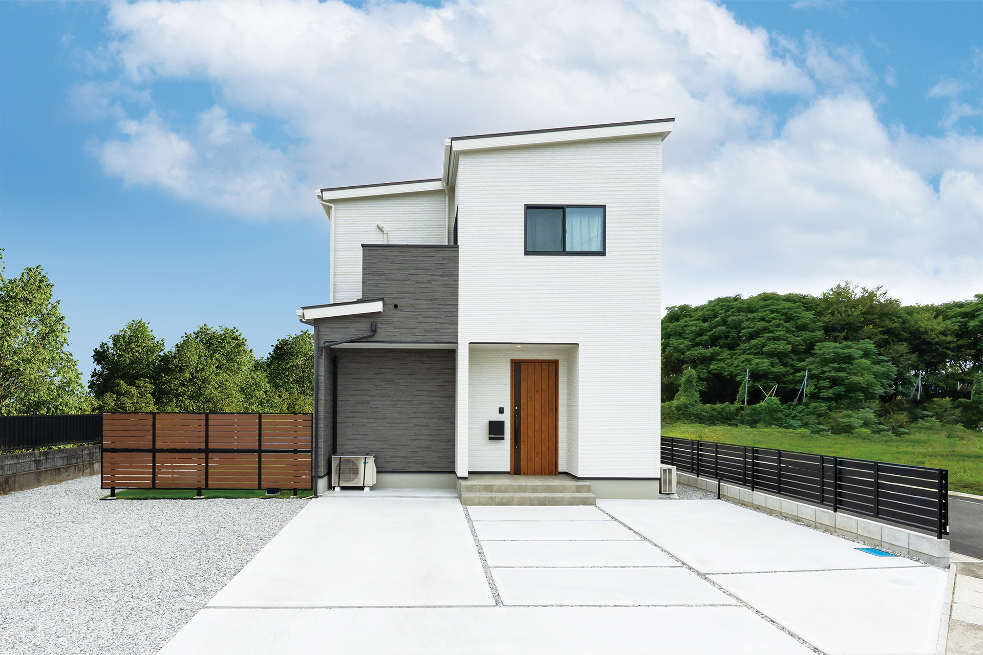 ホワイトベースにグレーの外壁材がメリハリを生み、玄関ドアとお庭の囲いの木目調がアクセントになった外観デザイン。