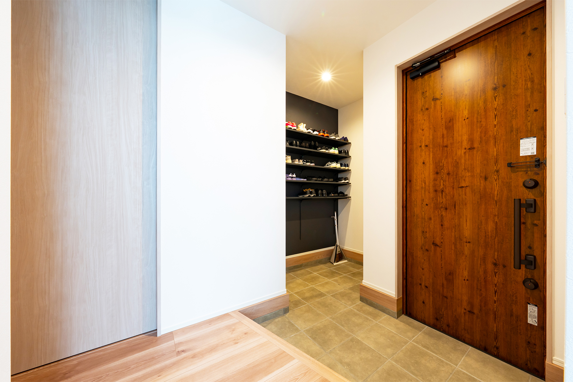 靴以外に、掃除道具や傘なども収納可能なシューズインクローゼット。