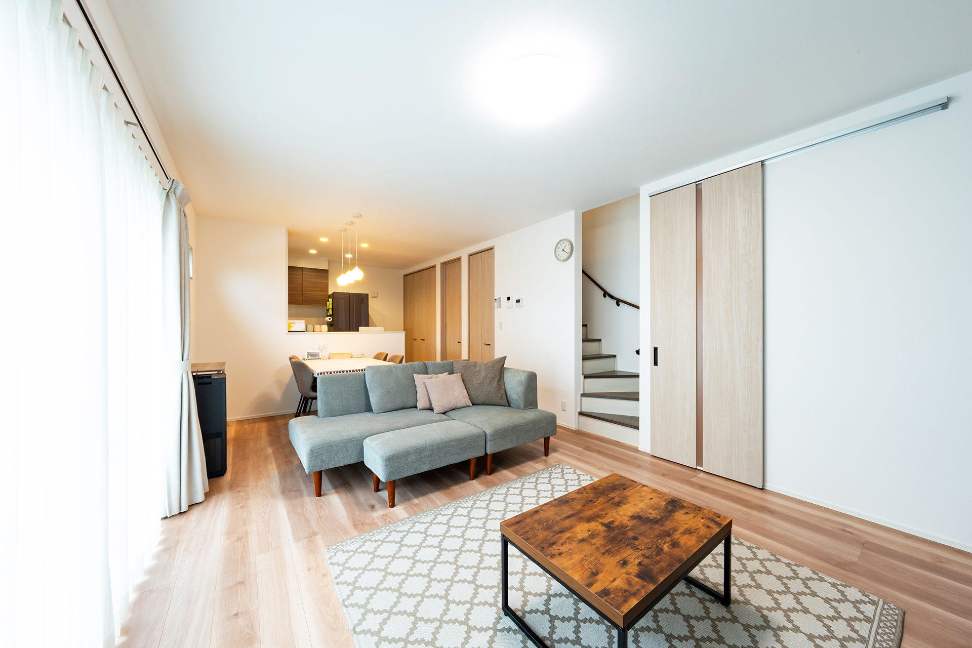 大きな窓が開放的な18帖のLDK。帰宅後、2階に上る前に「ただいま」「おかえり」を言い合えるリビング階段を採用。自然とコミュニケーションが生まれる間取りです。