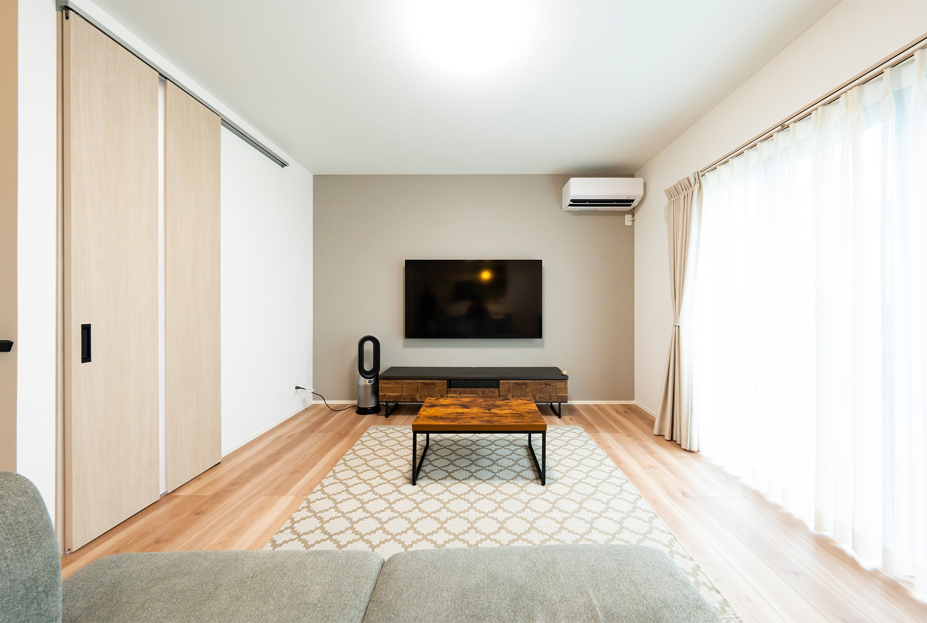 テレビ背面にグレーのアクセントクロスを採用。落ち着きのある色で、テレビを見ていても目が疲れ過ぎないひと工夫を。家族みんなでゆったりくつろげるリビングです。