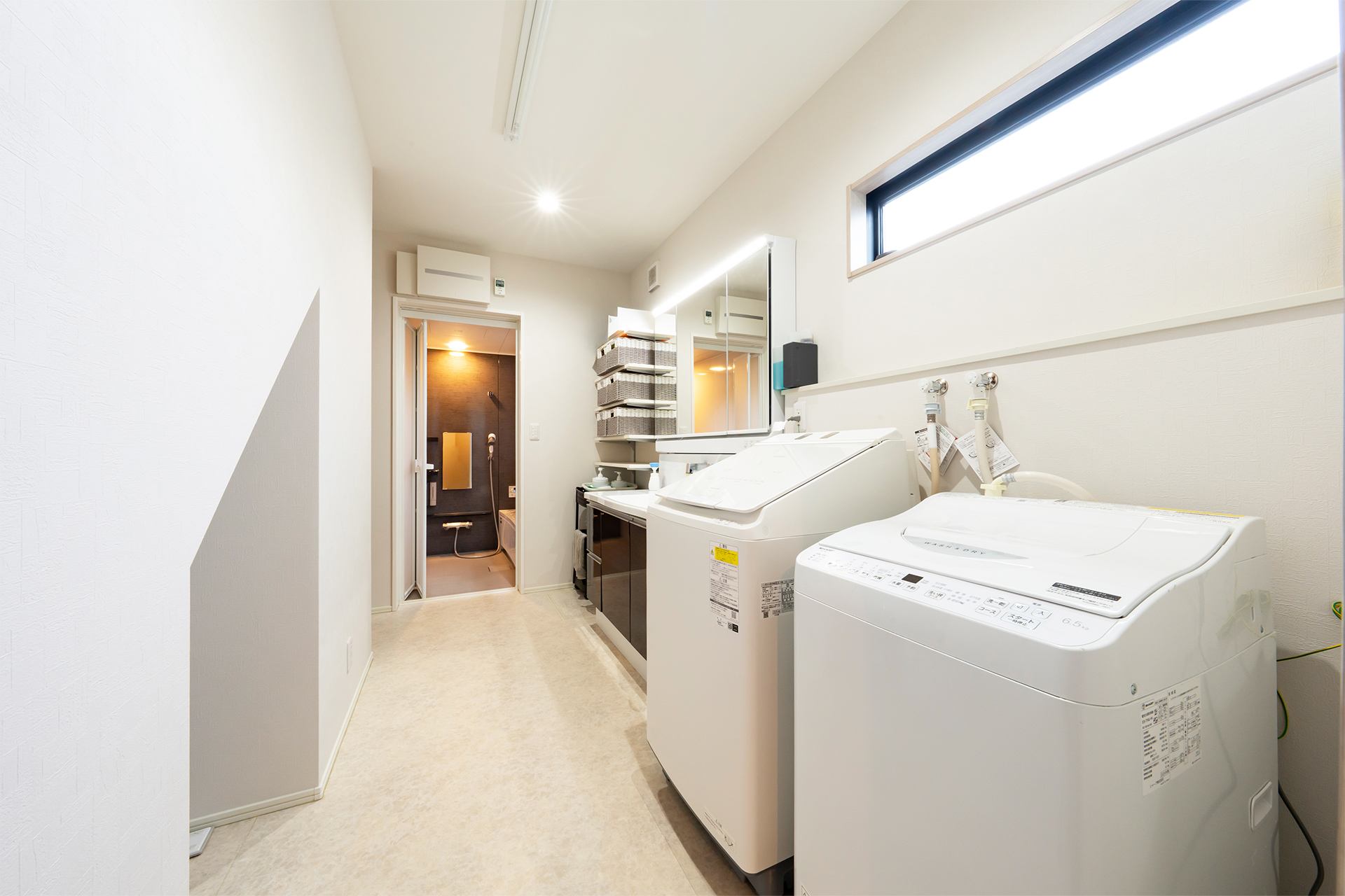 室内干しに便利な物干しバー付きの洗面脱衣室。ホワイトをベースにした清潔感のある空間です。