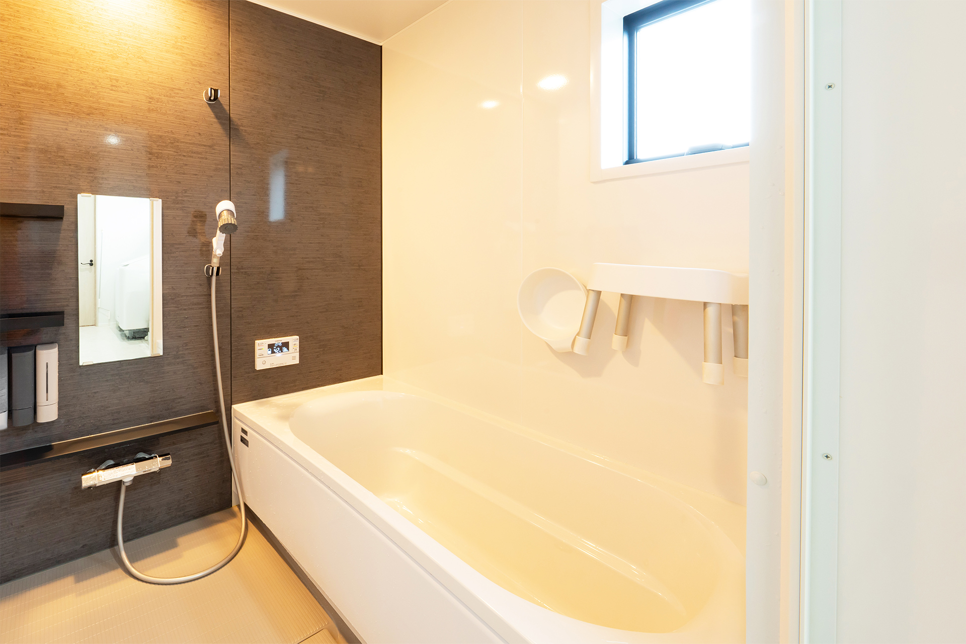 Takara standard リラクシアのシステムバス。お掃除しやすいホーローパネルで、風呂桶やシャンプーボトルなど、全て浮かせて収納できます。