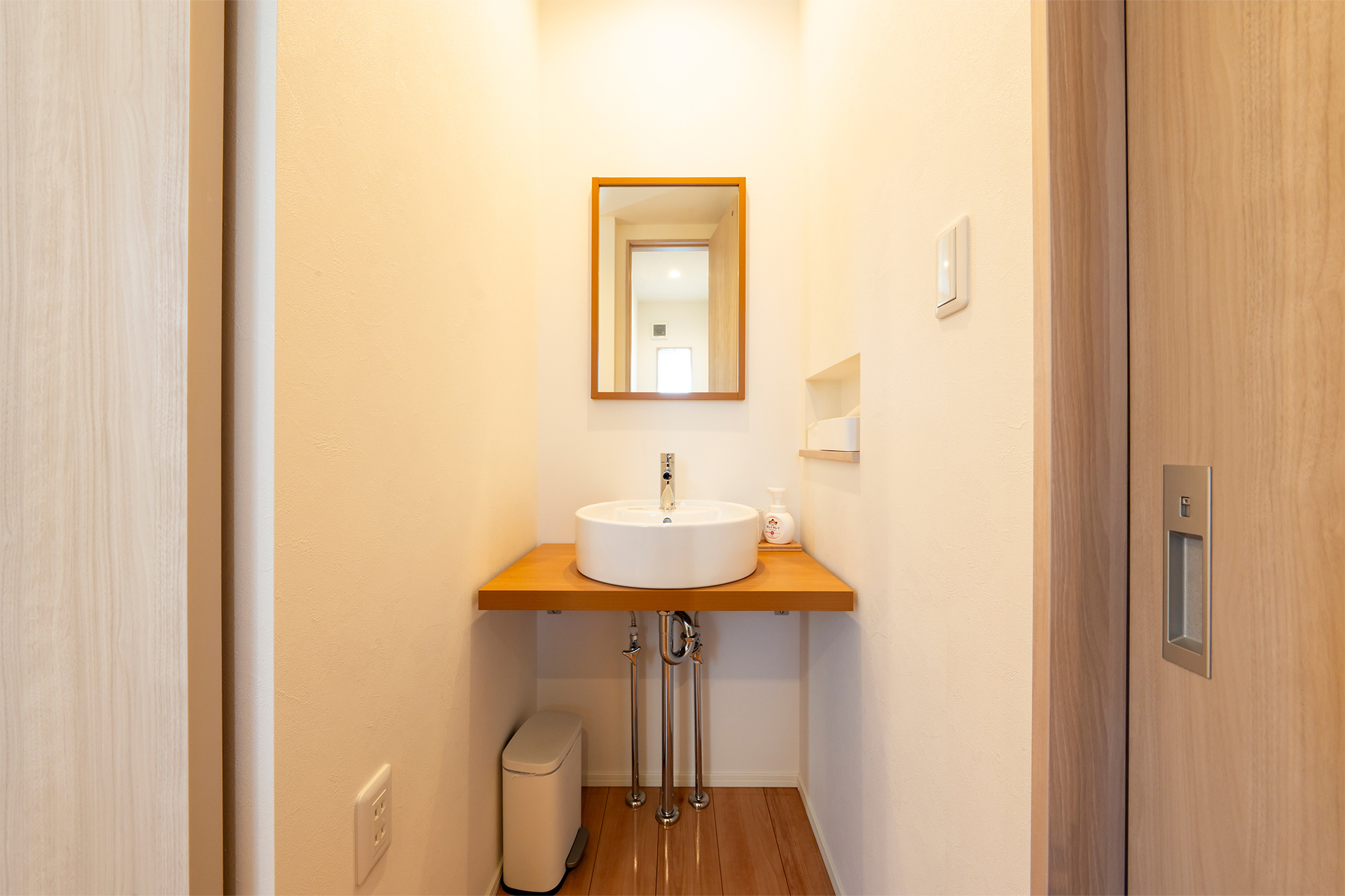 丸い洗面ボウルが可愛らしいトイレ横の手洗いスペース。小物を置けるニッチ付き。
