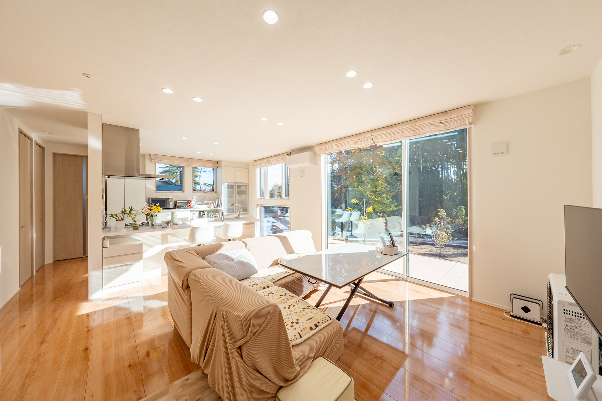 時折やってくる野鳥や紅葉などを眺められる憩いのLDKは約20帖。大開口の窓から明るい光が入ります。お食事はダイニングでも、キッチンカウンターでも。