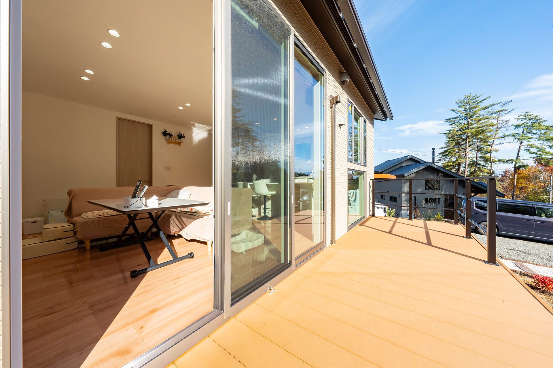 晴れた日には、リビングから繋がるウッドデッキへ裸足のままでも出られます。