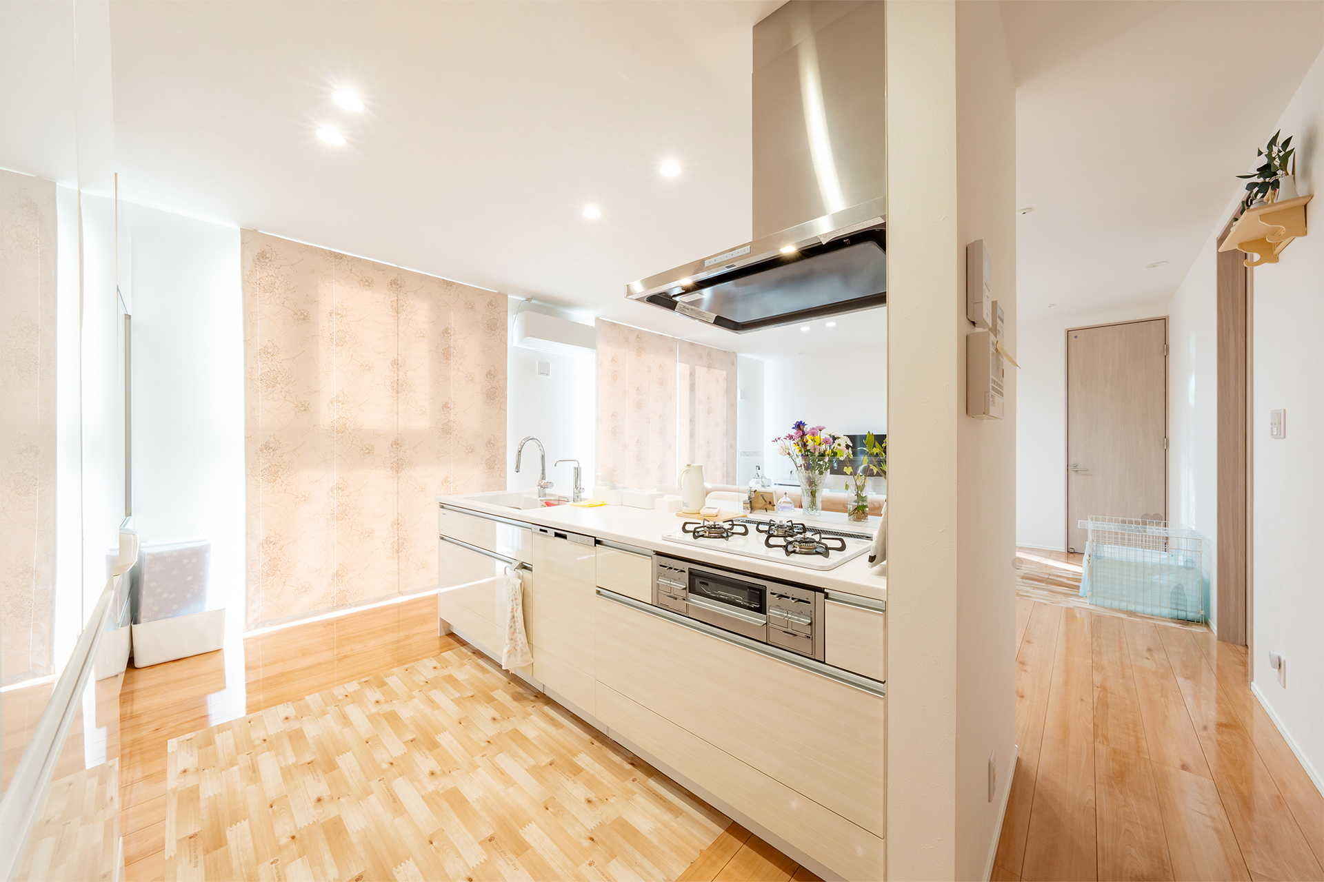 キッチンはガスコンロ。カップボードとの間は広くとり、並んでも充分なゆとりがあります。