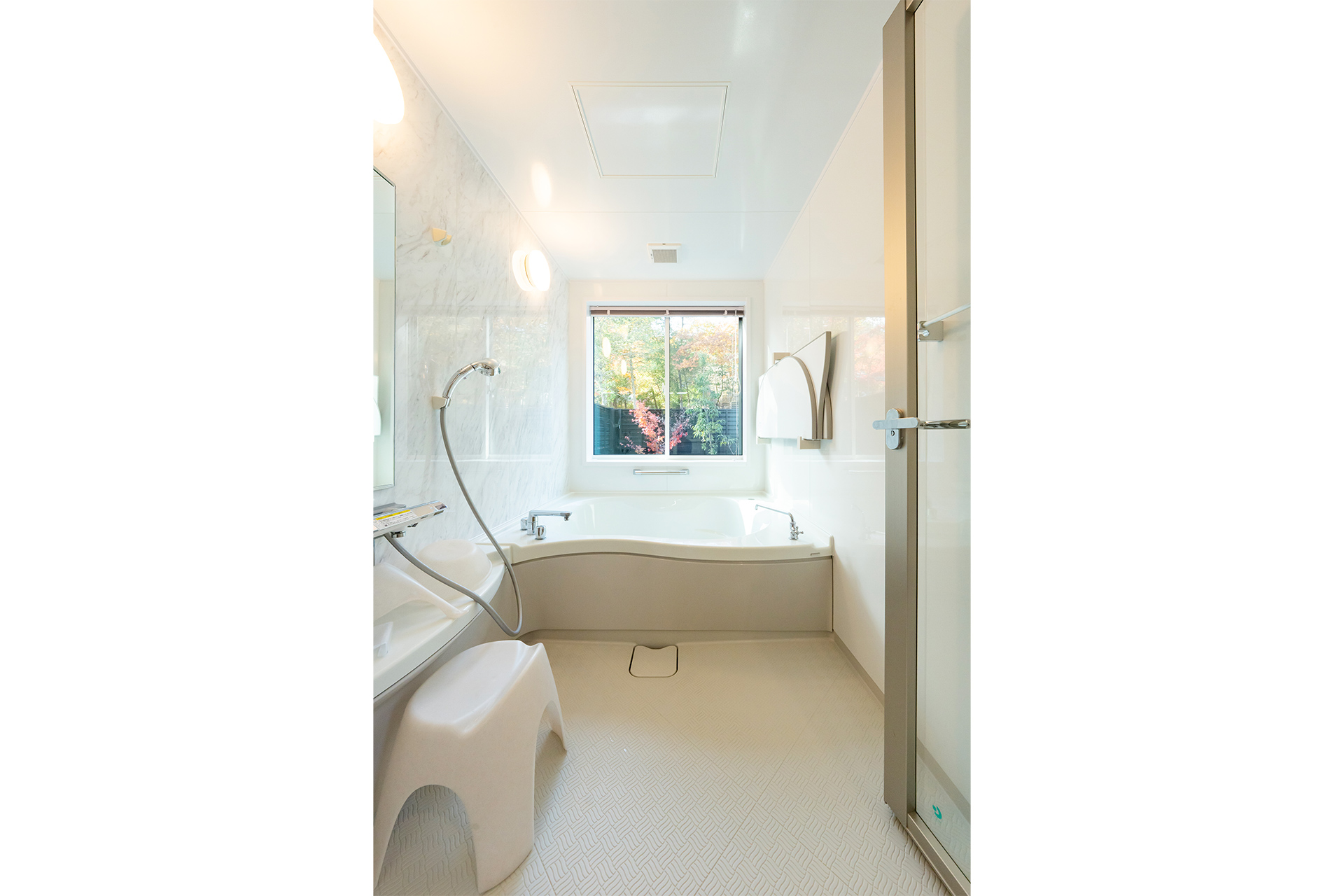 大開口の窓から四季の移ろいを愉しむ特等室。温泉宿のように過ごせる「絶景バスルーム」のある平屋