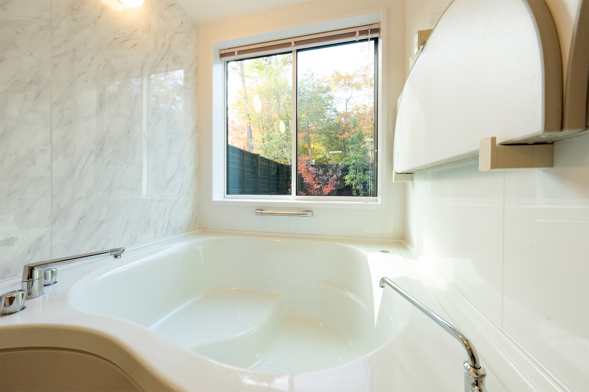 TOTOの1624サイズ ユニットバス。大開口の窓から中庭を楽しみながらゆったりバスタイムを愉しめます。