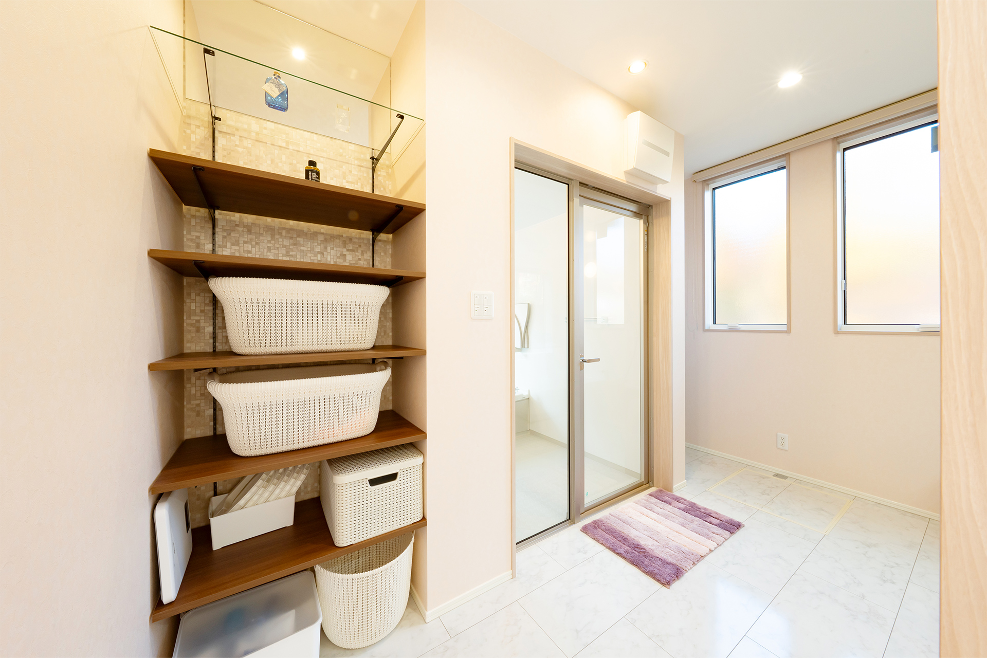 洗面脱衣室はなんと約5.3帖、奥にはトイレ。可動棚も揃い、まるで温泉宿のようです。