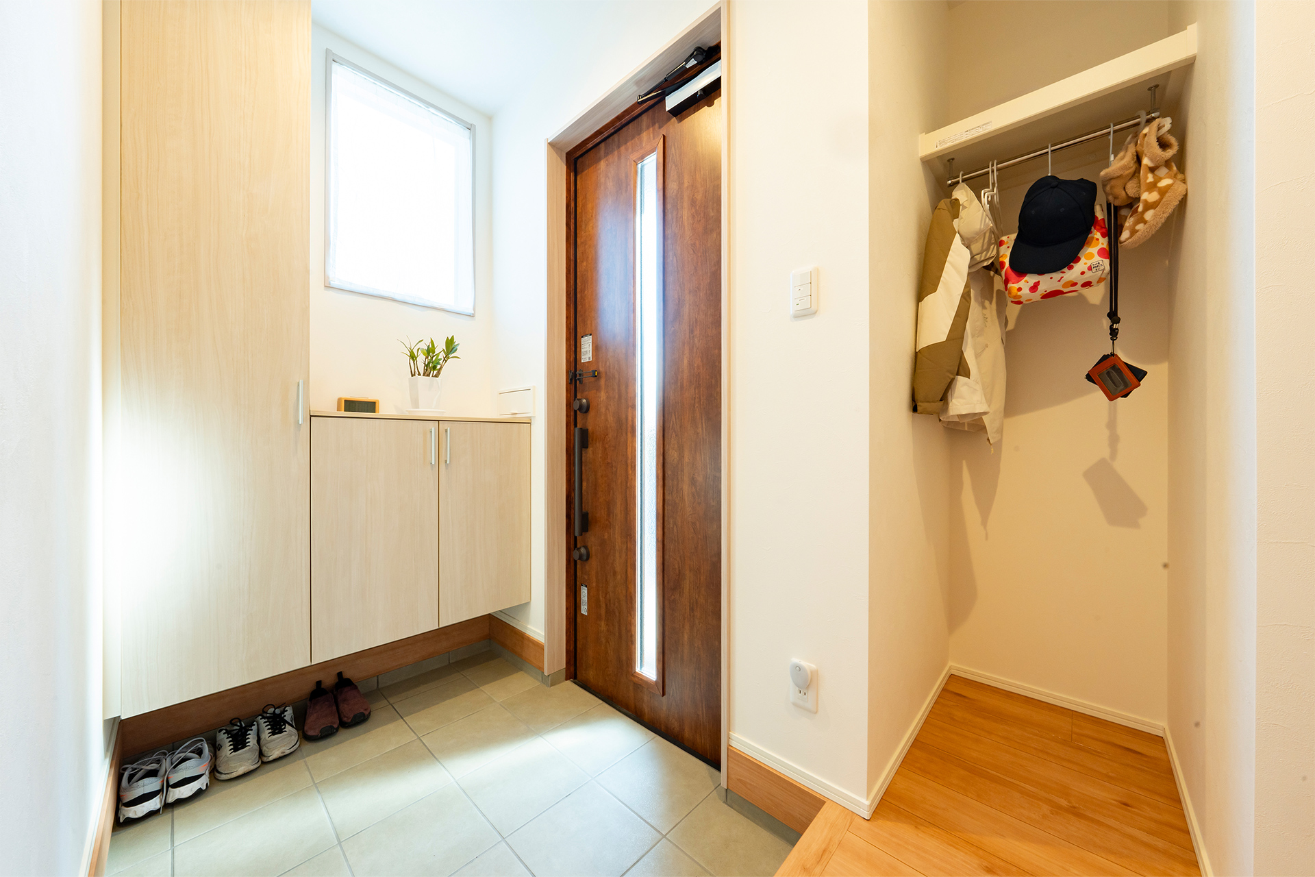 玄関には、シューズボックスの他、枕棚と、ハンガー用のポールの付いた収納も。